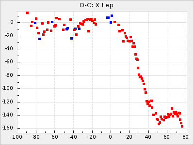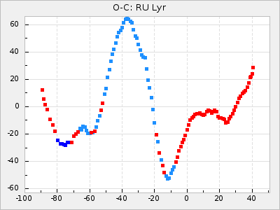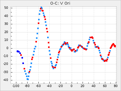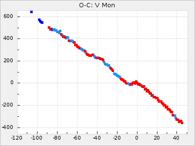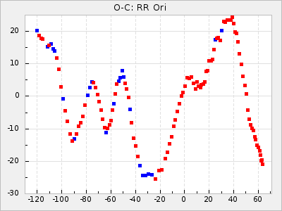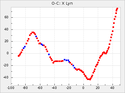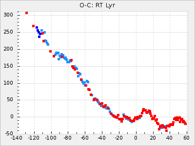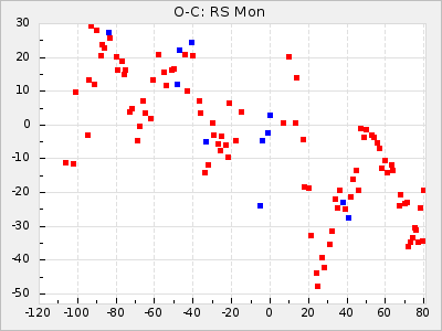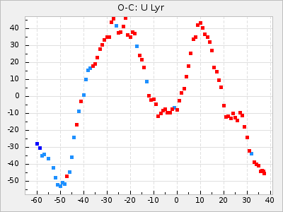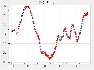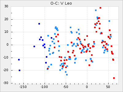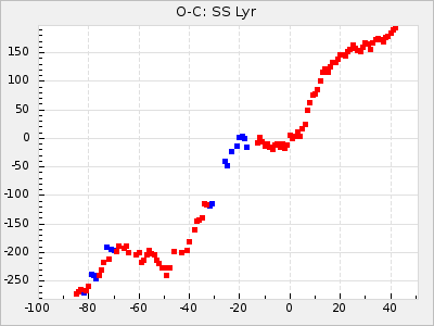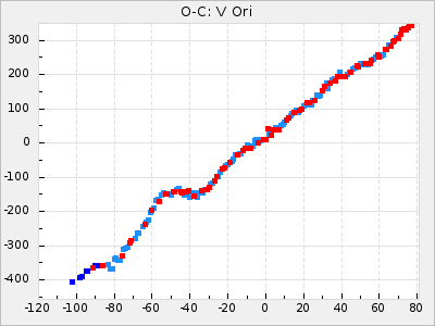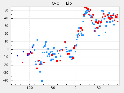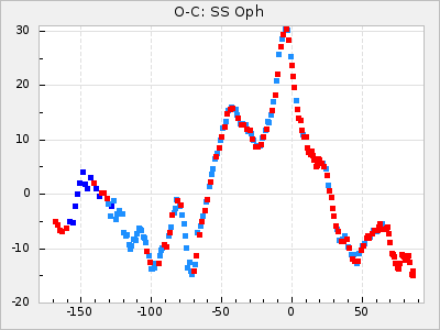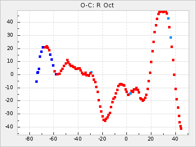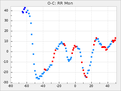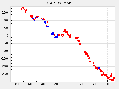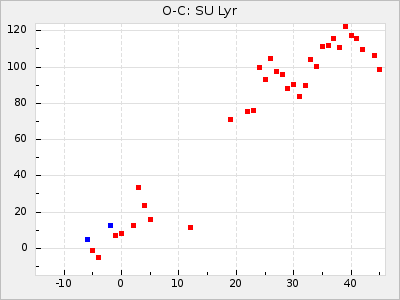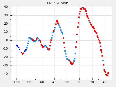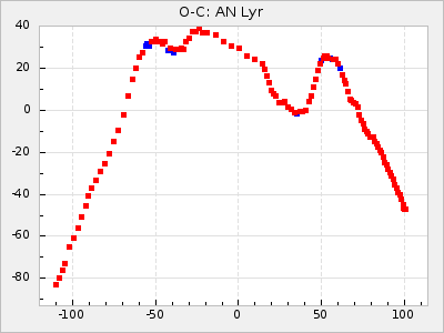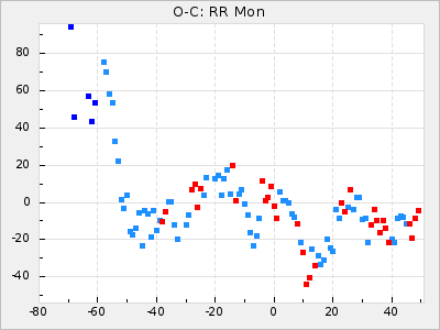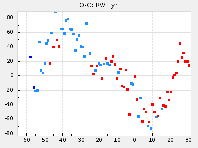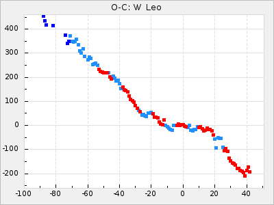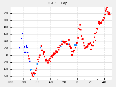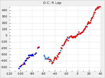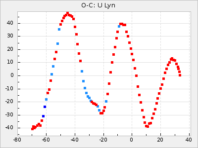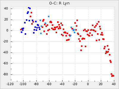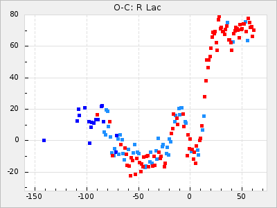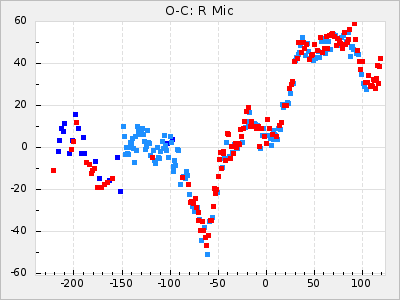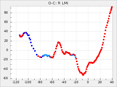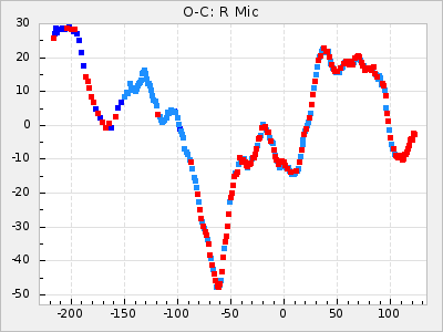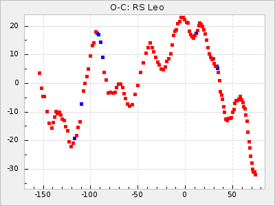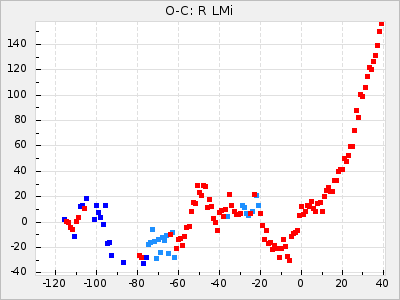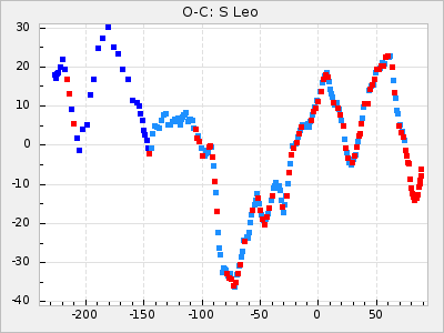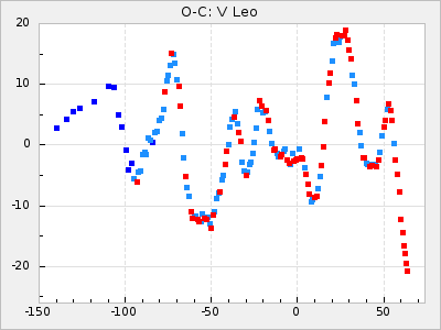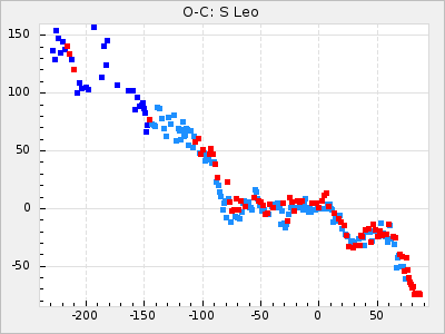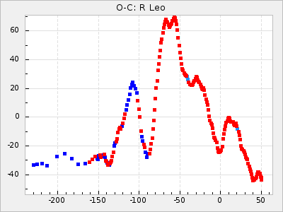 Here are O-C diagrams for a selection of Mira stars. The diagrams shows the cycle number (E) on the x-axis and O-C in days on the y-axis. The red dots are maxima that are fitted from observations, the lightblue are maxima published by AAVSO and the darkblue are maxima collected from various other published sources. The fitted maxima are based on observation data from AAVSO, AFOEV, VSOLJ, BAA/VSS, ASAS-SN and DASCH and calculated by using a mean lightcurve for each star. The mean lightcurves used can be found here. For a maxima to be recognized it had to fulfil these criteria: