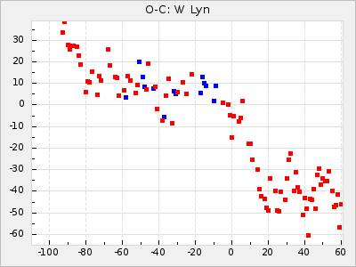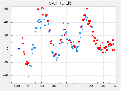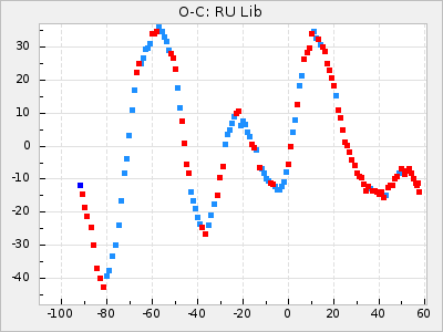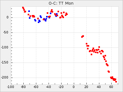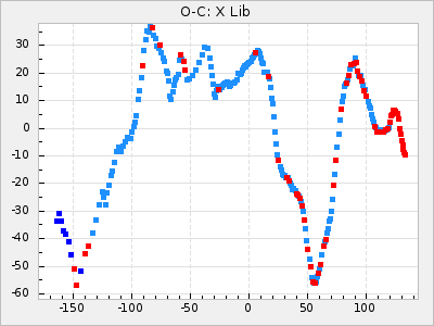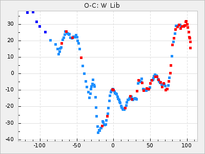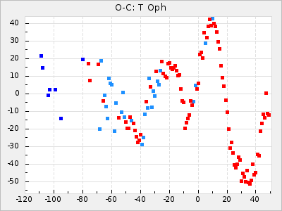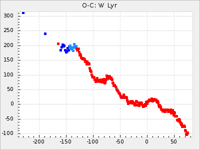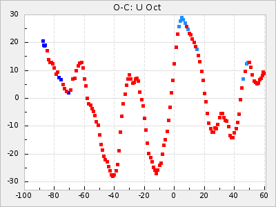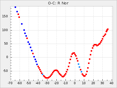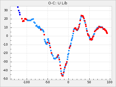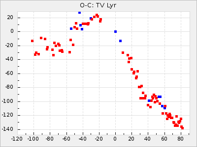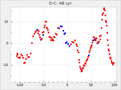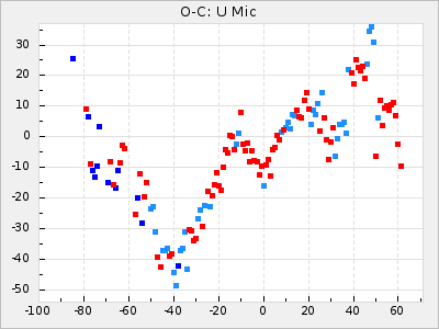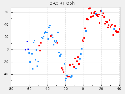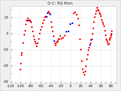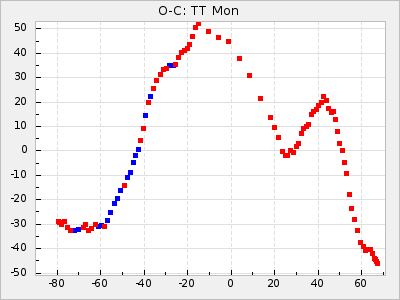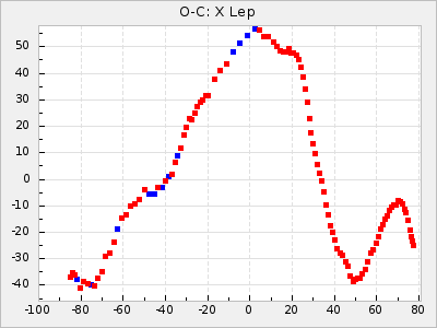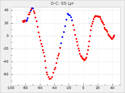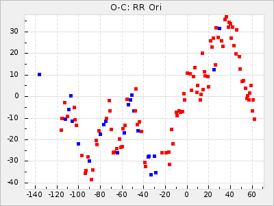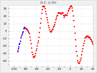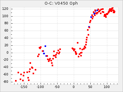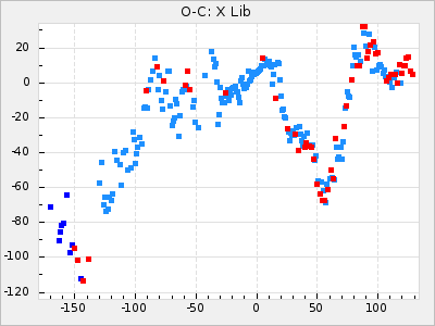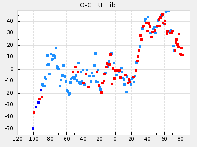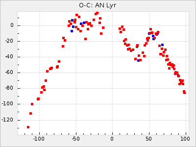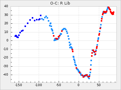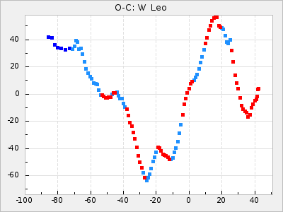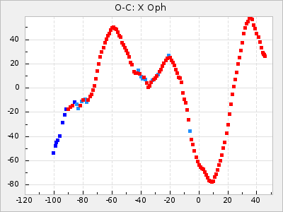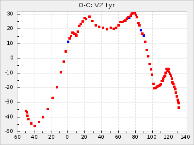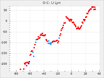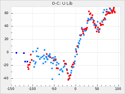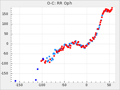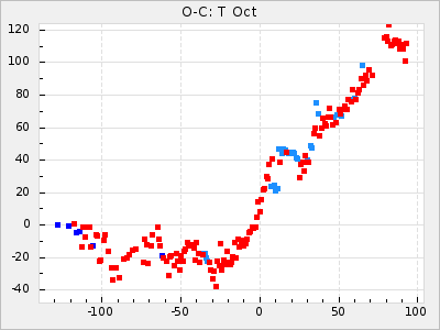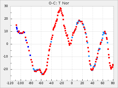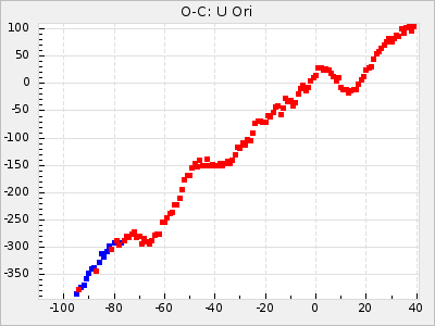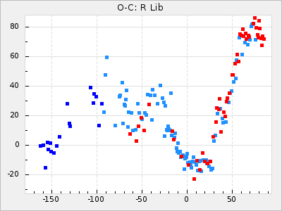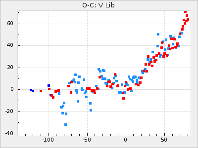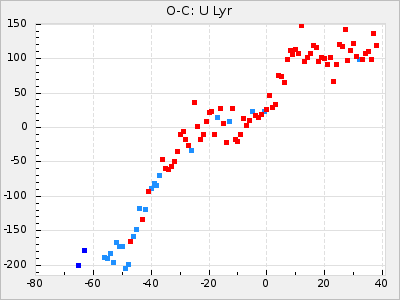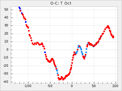 Here are O-C diagrams for a selection of Mira stars. The diagrams shows the cycle number (E) on the x-axis and O-C in days on the y-axis. The red dots are maxima that are fitted from observations, the lightblue are maxima published by AAVSO and the darkblue are maxima collected from various other published sources. The fitted maxima are based on observation data from AAVSO, AFOEV, VSOLJ, BAA/VSS, ASAS-SN and DASCH and calculated by using a mean lightcurve for each star. The mean lightcurves used can be found here. For a maxima to be recognized it had to fulfil these criteria: