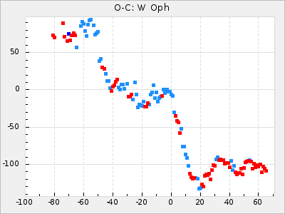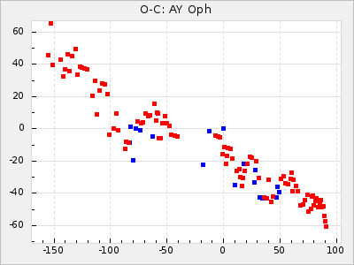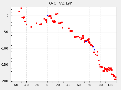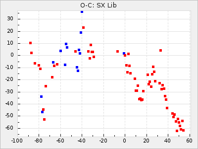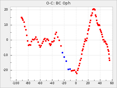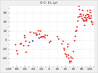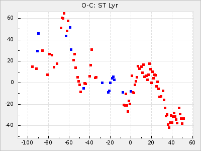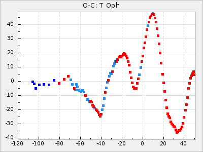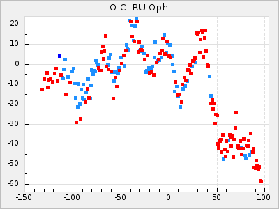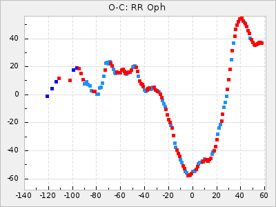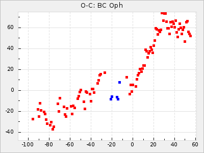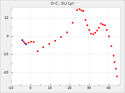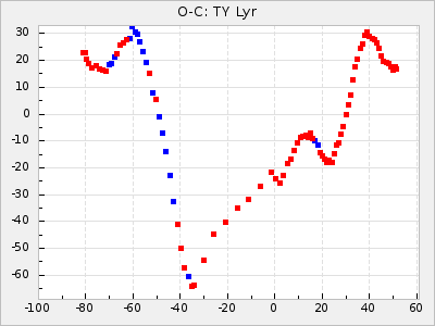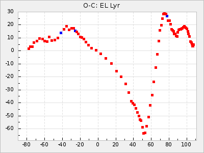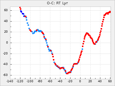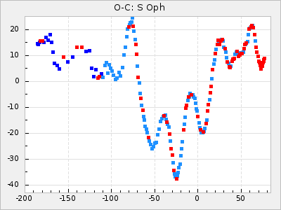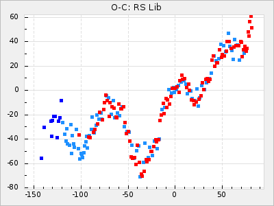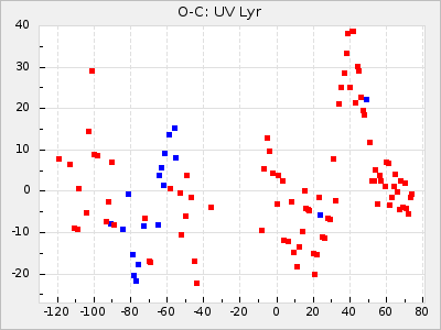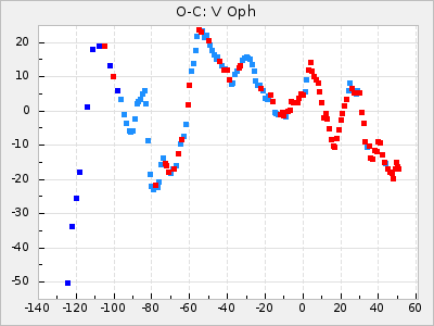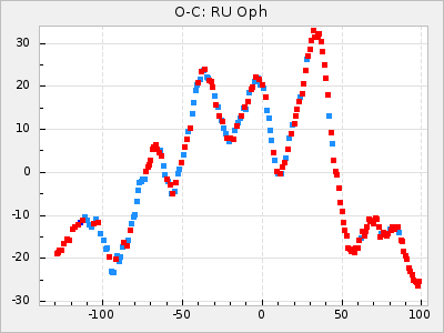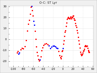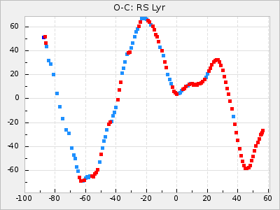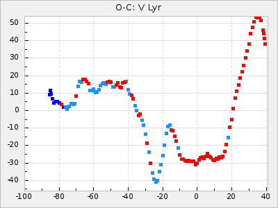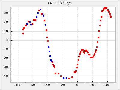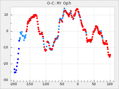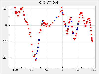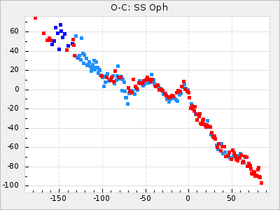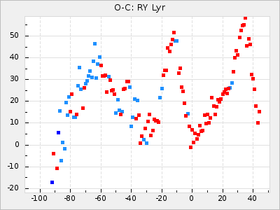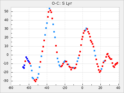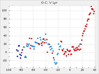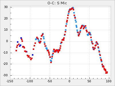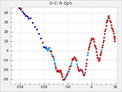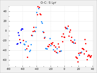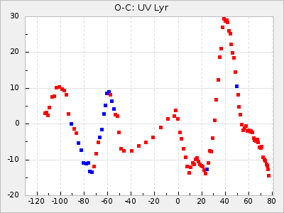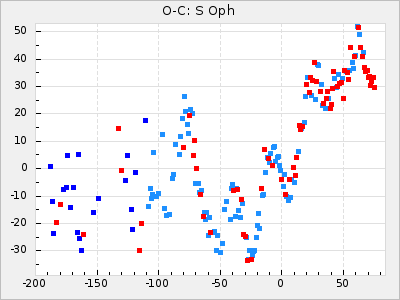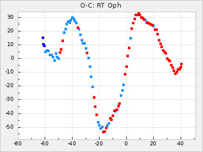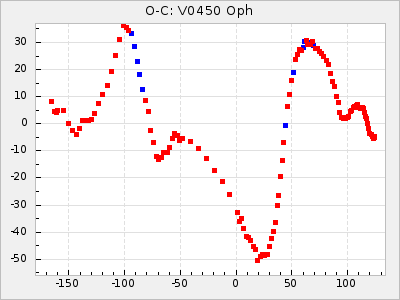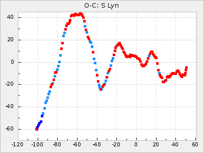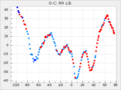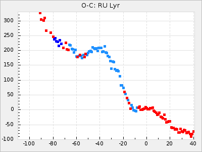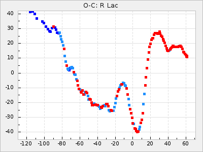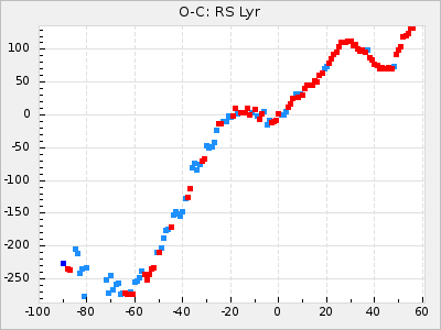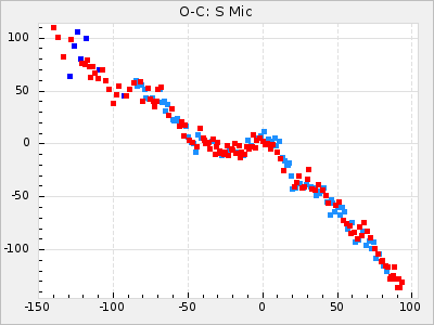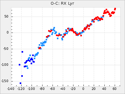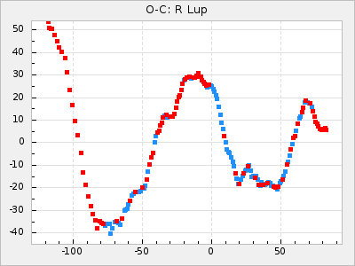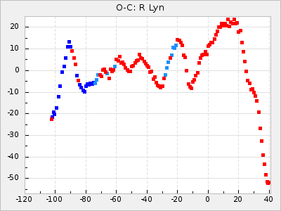 When a maximum fulfilling the criteria was found the mean lightcurve was fitted to the observations and the time and magnitude was noted. A preliminary O-C was then calculated by using the elements from GCVS4. In some cases a manual correction of the O-C was needed if the O-C is out of phase with more than a half cycle. From these O-C values an adjusted mean period and epoch was derived and new O-C values were calculated and plotted in the diagrams below.