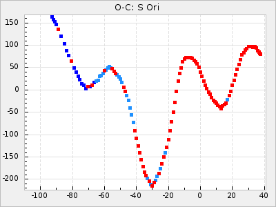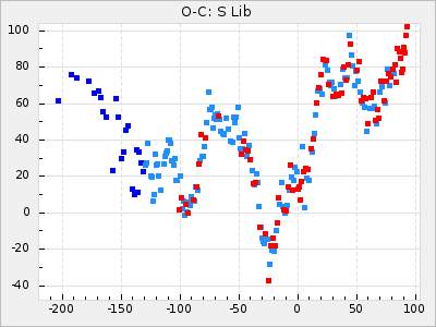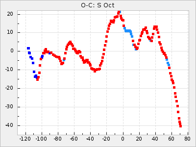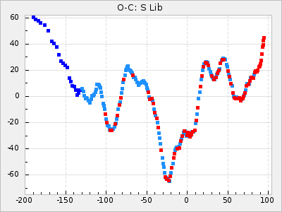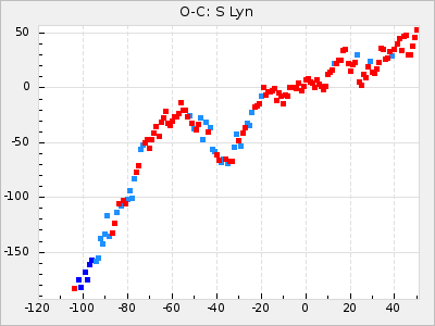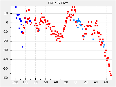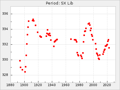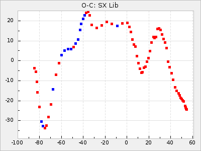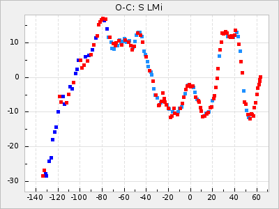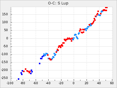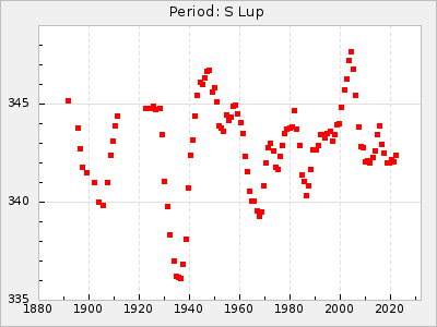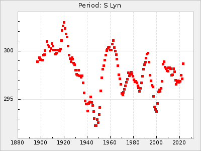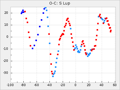 Mean period: 378.37, Mean epoch: 2445159.1 LC Avg Per ΔP: -0.38 ±0.03 (t:11.1, r2:0.465), ΔEpoch: -15.9 ΔP/C: -0.01 ±0.002 (t:5.8, r2:0.195) Mag at max: 8.1 ±0.3 (7.2-9.2) GCVS period: 378.75, GCVS epoch: 2445175 GCVS spectral type: S2.5,5e-S6,8e: E/P (X=15) ε2: 16.7, 2a2: 76.7, r2: 0.923 E/P (X=5) ε2: 18.7, 2a2: 59.5, r2: 0.803 |