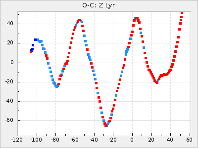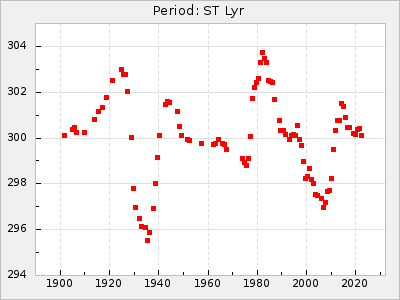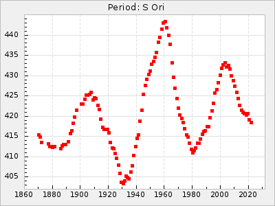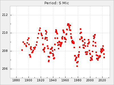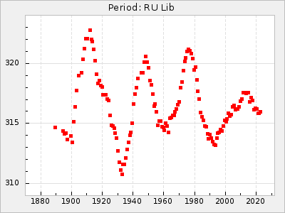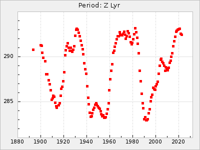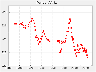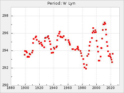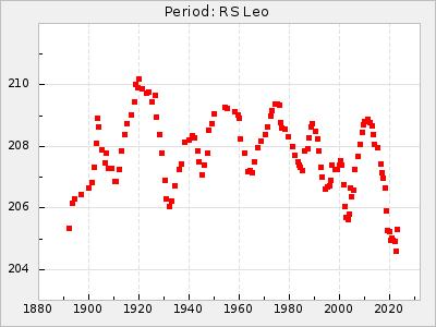 Mean period: 288.31, Mean epoch: 2445237.4 LC Avg Per ΔP: -3.39 ±0.05 (t:64.2, r2:0.964), ΔEpoch: -28.6 ΔP/C: 0.009 ±0.002 (t:3.7, r2:0.081) Mag at max: 10.2 ±0.3 (9.3-11.4) GCVS period: 291.7, GCVS epoch: 2445266 GCVS spectral type: M4e-M5.5:e E/P (X=15) ε2: 110.4, 2a2: -208.9, r2: 0.984 E/P (X=5) ε2: 64.9, 2a2: -45, r2: 0.981 |