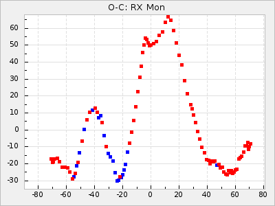 Mean period: 350.23, Mean epoch: 2445123.2 LC Avg Per ΔP: 3.9 ±0.08 (t:50.8, r2:0.959), ΔEpoch: 33.2 ΔP/C: 0.021 ±0.004 (t:4.9, r2:0.178) Mag at max: 10.1 ±0.4 (9.3-11.1) GCVS period: 346.33, GCVS epoch: 2445090 GCVS spectral type: M5IIIe E/P (X=15) ε2: 134.2, 2a2: -291.7, r2: 0.966 E/P (X=5) ε2: 60.1, 2a2: -18.4, r2: 0.991 |
