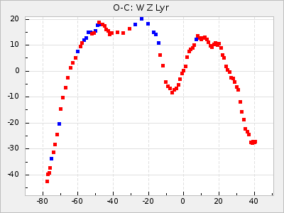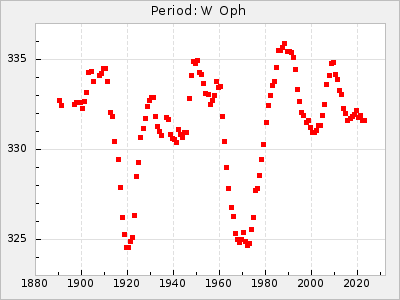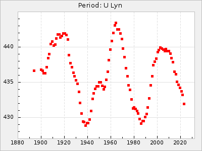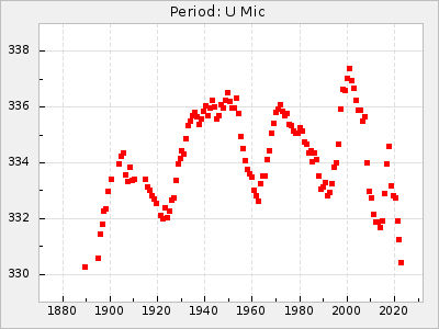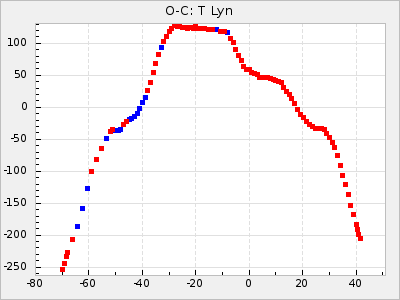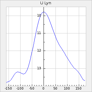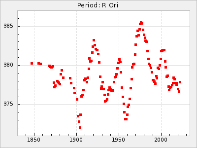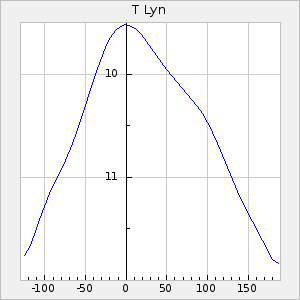 Mean period: 334.24, Mean epoch: 2444937.6 LC Avg Per ΔP: -6.26 ±0.04 (t:141.8, r2:0.993), ΔEpoch: -34.4 ΔP/C: -0.009 ±0.002 (t:4.1, r2:0.107) Mag at max: 7.1 ±0.5 (6.0-10.3) GCVS period: 340.5, GCVS epoch: 2444972 GCVS spectral type: M5e-M8e E/P (X=15) ε2: 46.8, 2a2: -57, r2: 0.979 E/P (X=5) ε2: 29.2, 2a2: 10.8, r2: 0.994 |