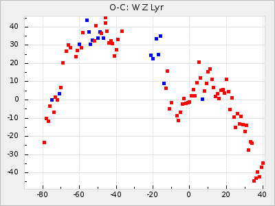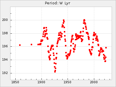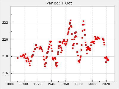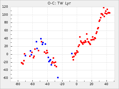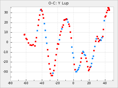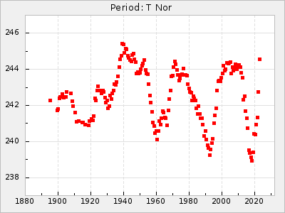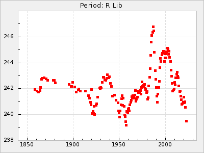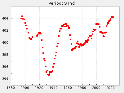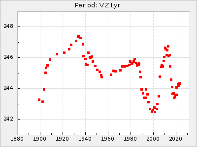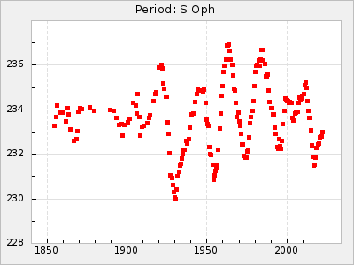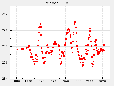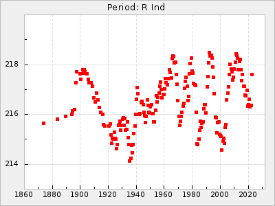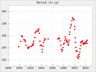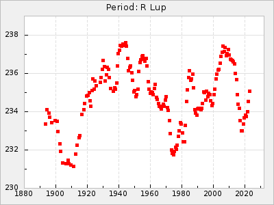 Mean period: 237.85, Mean epoch: 2438490.7 LC Avg Per ΔP: 0.35 ±0.02 (t:20.7, r2:0.713), ΔEpoch: 16.7 ΔP/C: 0.001 ±0.001 (t:2.3, r2:0.029) Mag at max: 11.1 ±0.5 (9.2-12.9) GCVS period: 237.5, GCVS epoch: 2438474 GCVS spectral type: M4e-M5.5e E/P (X=15) ε2: 10.6, 2a2: 24.5, r2: 0.984 E/P (X=5) ε2: 10.9, 2a2: 23.9, r2: 0.98 |
