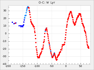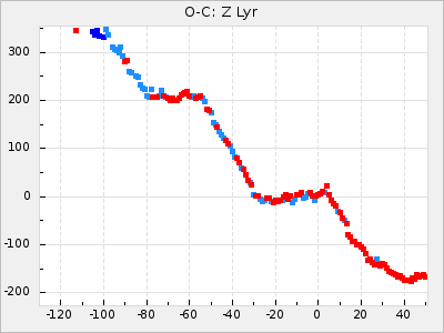 Mean period: 194.90, Mean epoch: 2442132.4 LC Avg Per ΔP: -0.37 ±0.01 (t:32.9, r2:0.897), ΔEpoch: -18.6 ΔP/C: 0.001 ±0 (t:1.8, r2:0.026) Mag at max: 10.9 ±0.3 (10.5-11.5) GCVS period: 195.27, GCVS epoch: 2442151 GCVS spectral type: E/P (X=15) ε2: 5.6, 2a2: 27.5, r2: 0.897 E/P (X=5) ε2: 6, 2a2: 25.1, r2: 0.629 |