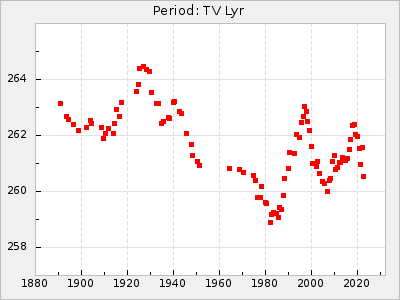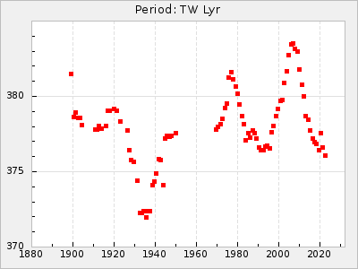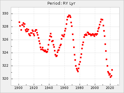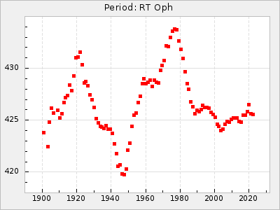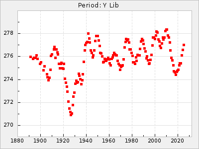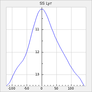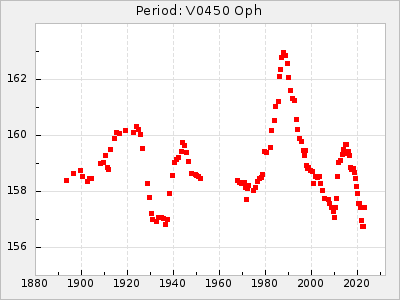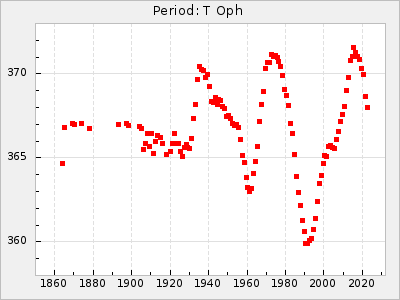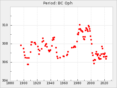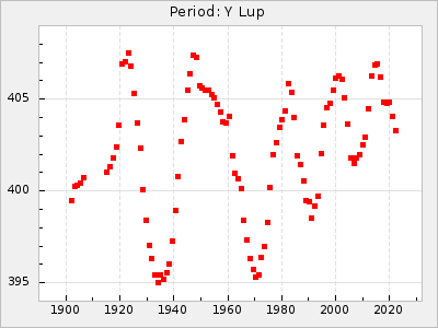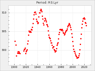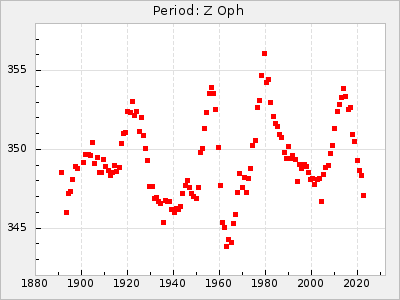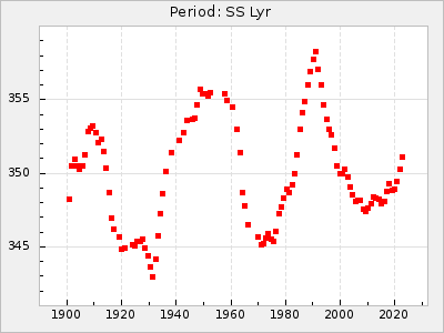 Mean period: 342.85, Mean epoch: 2441777.2 LC Avg Per ΔP: 3.12 ±0.04 (t:74.2, r2:0.979), ΔEpoch: 15.2 ΔP/C: 0.009 ±0.002 (t:4.4, r2:0.142) Mag at max: 8.8 ±0.4 (7.7-9.9) GCVS period: 339.73, GCVS epoch: 2441762 GCVS spectral type: Se E/P (X=15) ε2: 32.6, 2a2: 44, r2: 0.984 E/P (X=5) ε2: 36.3, 2a2: 36.1, r2: 0.987 |