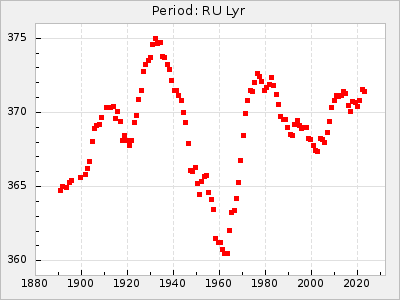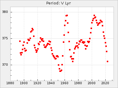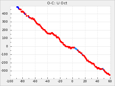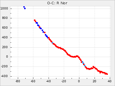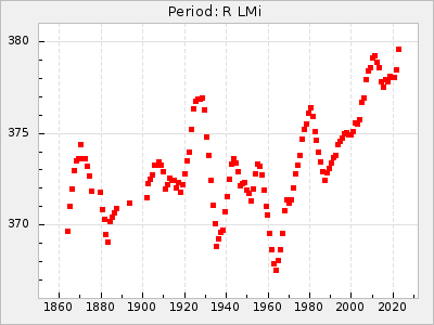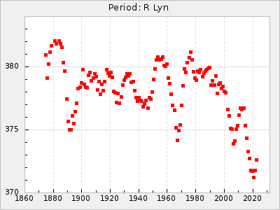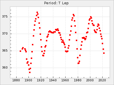 Mean period: 378.78, Mean epoch: 2441448.9 LC Avg Per ΔP: 1.68 ±0.06 (t:27.7, r2:0.846), ΔEpoch: 57.9 ΔP/C: 0.023 ±0.002 (t:11.6, r2:0.492) Mag at max: 9.6 ±0.3 (9.2-11.0) GCVS period: 377.1, GCVS epoch: 2441391 GCVS spectral type: C8,2e(Ne) E/P (X=15) ε2: 55.5, 2a2: -18.1, r2: 0.992 E/P (X=5) ε2: 39.3, 2a2: 36, r2: 0.966 |