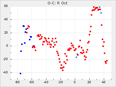 The 3rd row shows the same thing but for a parabolic fit. A parabolic O-C diagram suggest that the period is changing in a steady pace and ΔP/C shows the amount in days per cycle that best fit the diagram. Care should be taken not to overestimate this information as most O-C diagram shows a lot of random scatter in the period that can create false relations. Stars with a high value of t: and a r2: near 1 could be candidates for Miras with a continuous changing period.