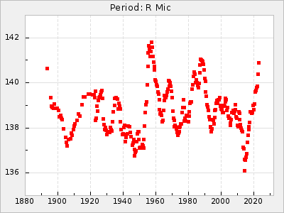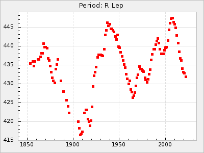 Mean period: 455.02, Mean epoch: 2442527.4 LC Avg Per ΔP: 3.3 ±0.12 (t:27.6, r2:0.888), ΔEpoch: 35.4 ΔP/C: -0.058 ±0.007 (t:8.4, r2:0.426) Mag at max: 9.7 ±0.5 (8.3-11.3) GCVS period: 451.72, GCVS epoch: 2442492 GCVS spectral type: C4,5e(N0e) E/P (X=15) ε2: 117.9, 2a2: -2, r2: 0.966 E/P (X=5) ε2: 49.6, 2a2: 230.1, r2: 0.788 |