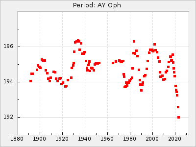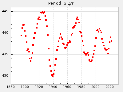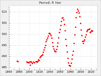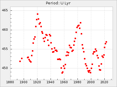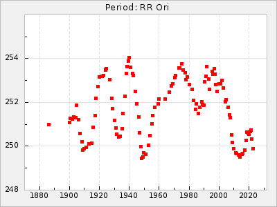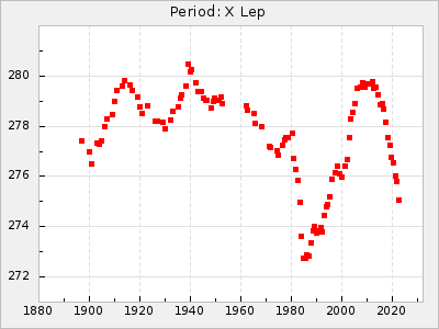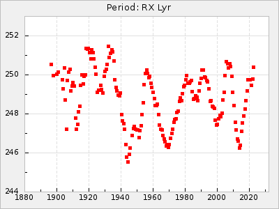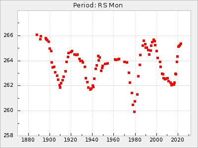 Mean period: 496.00, Mean epoch: 2441832.3 LC Avg Per ΔP: -11.5 ±0.25 (t:45.4, r2:0.956), ΔEpoch: -41.7 ΔP/C: 0.158 ±0.008 (t:19.2, r2:0.798) Mag at max: 7.5 ±0.4 (6.8-9.1) GCVS period: 507.5, GCVS epoch: 2441874 GCVS spectral type: M3e-M6II E/P (X=15) ε2: 313.4, 2a2: -290.5, r2: 0.993 E/P (X=5) ε2: 278.2, 2a2: -251.4, r2: 0.971 |