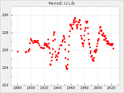 Mean period: 227.06, Mean epoch: 2439139.7 LC Avg Per ΔP: 0.47 ±0.02 (t:19.5, r2:0.676), ΔEpoch: 15.7 ΔP/C: 0.007 ±0.001 (t:10, r2:0.358) Mag at max: 9.7 ±0.4 (9.0-11.0) GCVS period: 226.59, GCVS epoch: 2439124 GCVS spectral type: M3e-M8.0e E/P (X=15) ε2: 14.2, 2a2: -1.1, r2: 0.989 E/P (X=5) ε2: 10.1, 2a2: 12.3, r2: 0.953 |