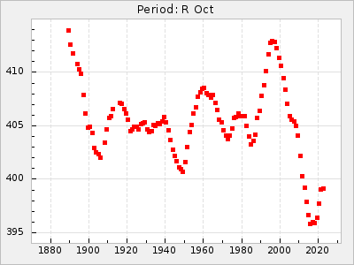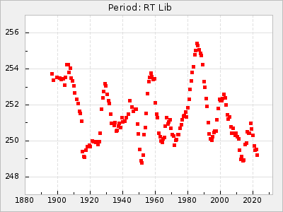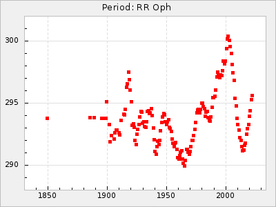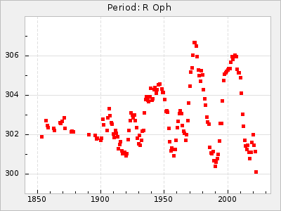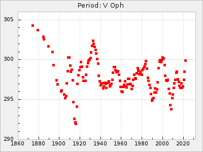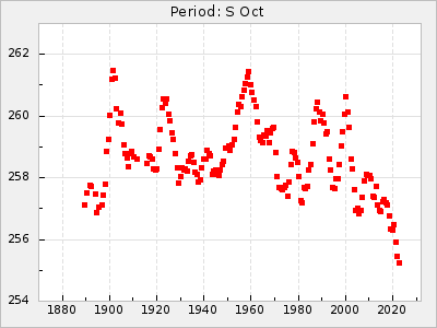 Mean period: 294.69, Mean epoch: 2442033.2 LC Avg Per ΔP: -0.51 ±0.02 (t:24, r2:0.846), ΔEpoch: -16.8 ΔP/C: -0.003 ±0.001 (t:2.7, r2:0.065) Mag at max: 10.2 ±0.4 (9.4-11.0) GCVS period: 295.2, GCVS epoch: 2442050 GCVS spectral type: M6 E/P (X=15) ε2: 8.6, 2a2: 37.7, r2: 0.865 E/P (X=5) ε2: 8.1, 2a2: 32.5, r2: 0.619 |