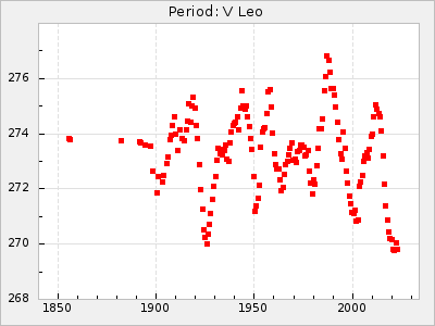 Mean period: 275.86, Mean epoch: 2444036.5 LC Avg Per ΔP: 0.16 ±0.04 (t:4.2, r2:0.095), ΔEpoch: 19.5 ΔP/C: 0.019 ±0.001 (t:23, r2:0.762) Mag at max: 8.7 ±0.4 (7.5-10.6) GCVS period: 275.7, GCVS epoch: 2444017 GCVS spectral type: M5e-M8.2e E/P (X=15) ε2: 14.1, 2a2: 5, r2: 0.989 E/P (X=5) ε2: 9.5, 2a2: 20.4, r2: 0.903 |