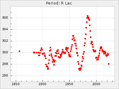 Mean period: 304.49, Mean epoch: 2442911.7 LC Avg Per ΔP: 3.08 ±0.09 (t:35.8, r2:0.903), ΔEpoch: -7.3 ΔP/C: -0.023 ±0.004 (t:5.7, r2:0.19) Mag at max: 10.5 ±0.3 (9.2-11.8) GCVS period: 301.41, GCVS epoch: 2442919 GCVS spectral type: M5e E/P (X=15) ε2: 113.7, 2a2: -227.4, r2: 0.973 E/P (X=5) ε2: 59.1, 2a2: -24.4, r2: 0.992 |