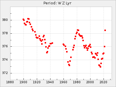 Mean period: 331.11, Mean epoch: 2438374.8 LC Avg Per ΔP: -1.57 ±0.05 (t:29.5, r2:0.864), ΔEpoch: -39.2 ΔP/C: 0.013 ±0.003 (t:5.1, r2:0.161) Mag at max: 10.1 ±0.4 (9.2-11.3) GCVS period: 332.68, GCVS epoch: 2438414 GCVS spectral type: M8e E/P (X=15) ε2: 71.1, 2a2: -112.2, r2: 0.986 E/P (X=5) ε2: 43, 2a2: -11.4, r2: 0.992 |
