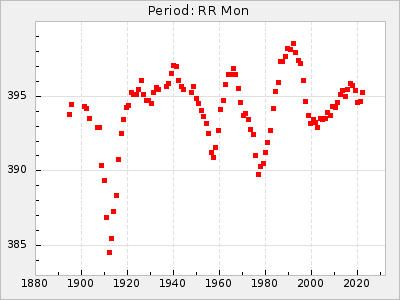 Mean period: 229.83, Mean epoch: 2440628.0 LC Avg Per ΔP: 1.93 ±0.04 (t:44.2, r2:0.909), ΔEpoch: -9 ΔP/C: -0.018 ±0.001 (t:15.6, r2:0.554) Mag at max: 9.1 ±0.3 (8.5-10.9) GCVS period: 227.9, GCVS epoch: 2440637 GCVS spectral type: M4e-M8.2e E/P (X=15) ε2: 38, 2a2: -66.8, r2: 0.961 E/P (X=5) ε2: 18.6, 2a2: 8.3, r2: 0.997 |