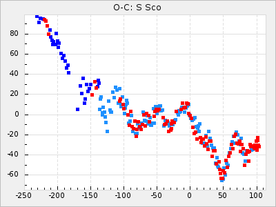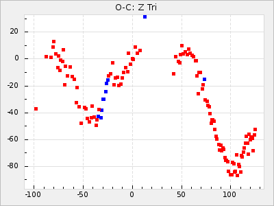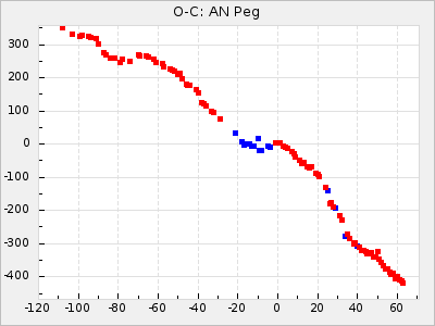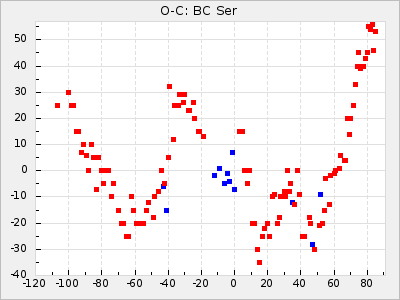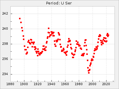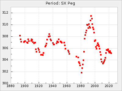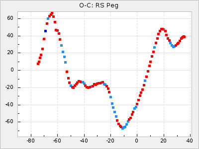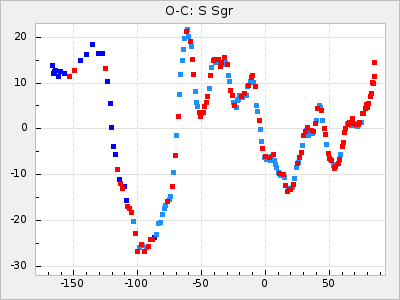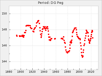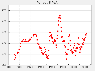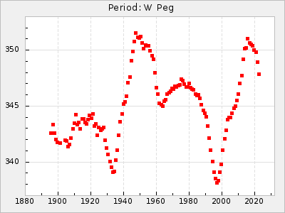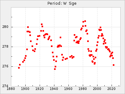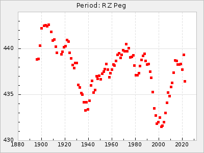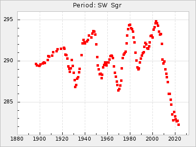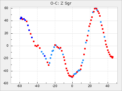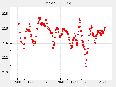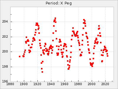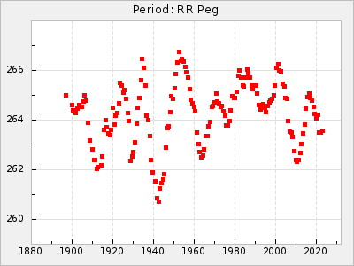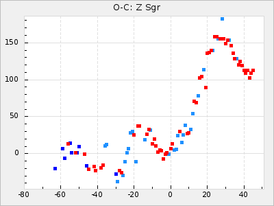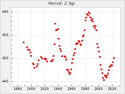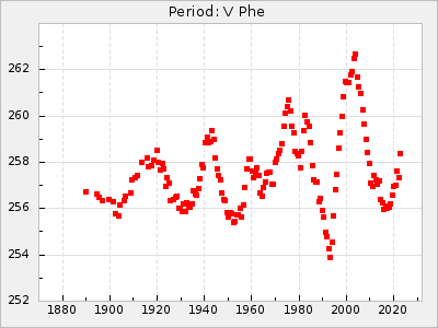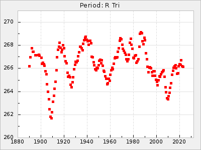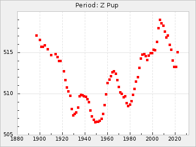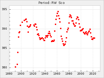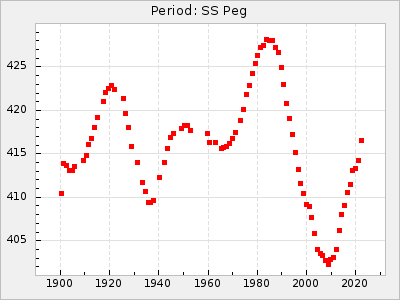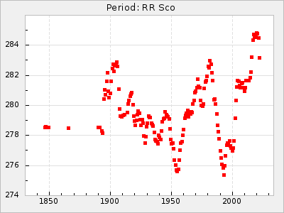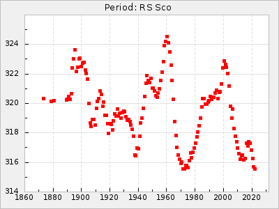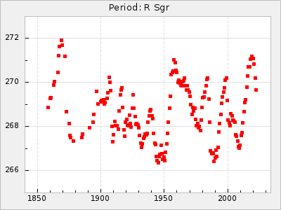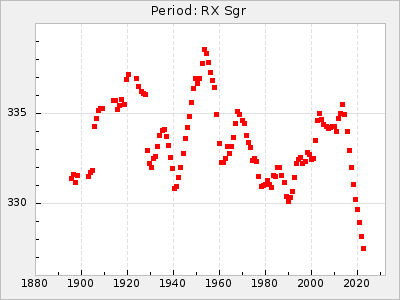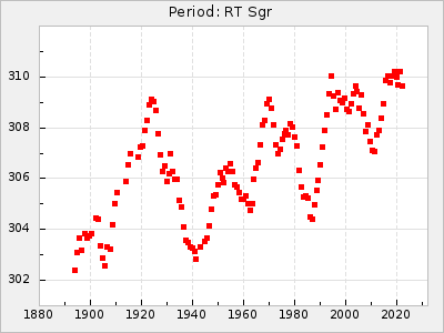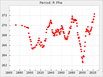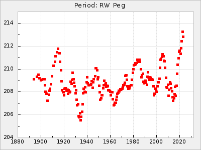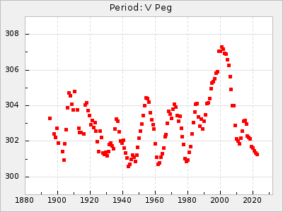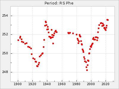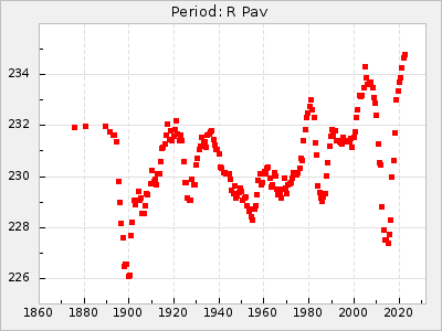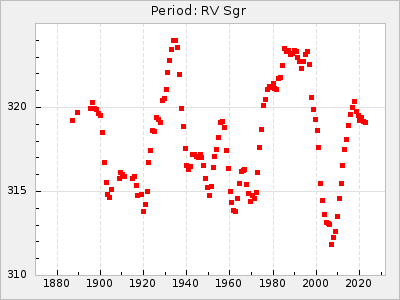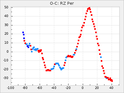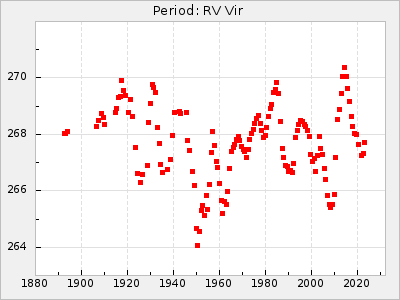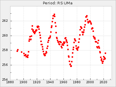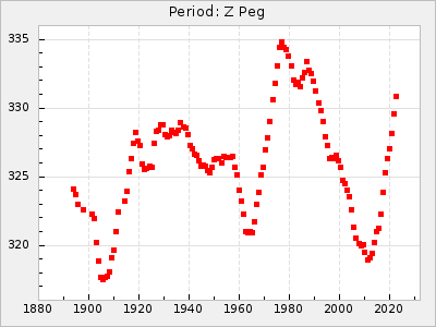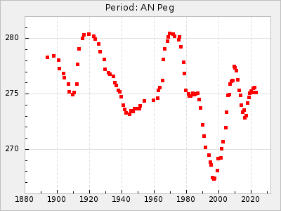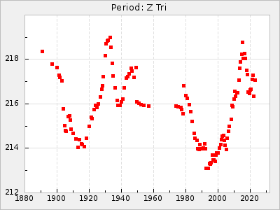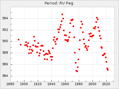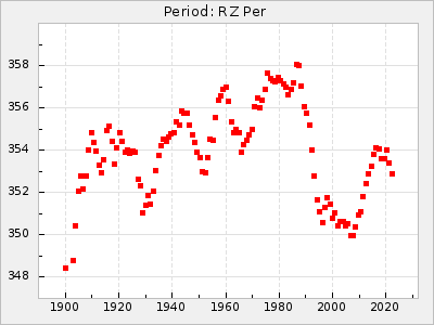 Mean period: 268.31, Mean epoch: 2439474.8 LC Avg Per ΔP: -0.95 ±0.04 (t:26.5, r2:0.814), ΔEpoch: -11.2 ΔP/C: 0.006 ±0.001 (t:4.4, r2:0.106) Mag at max: 8.2 ±0.4 (7.3-9.4) GCVS period: 269.26, GCVS epoch: 2439486 GCVS spectral type: M2(II)e-M4(III)e E/P (X=15) ε2: 29.8, 2a2: -34.6, r2: 0.966 E/P (X=5) ε2: 17.5, 2a2: 14.9, r2: 0.996 |