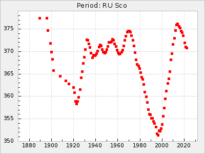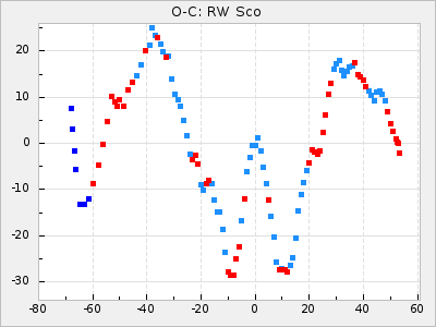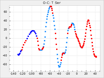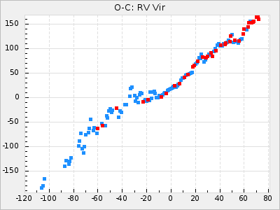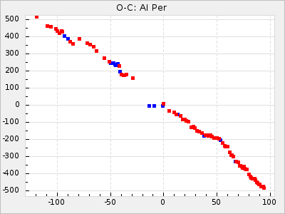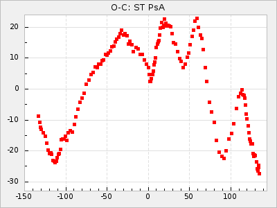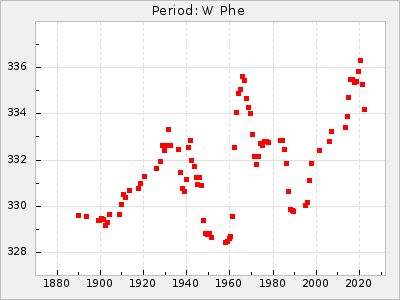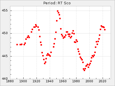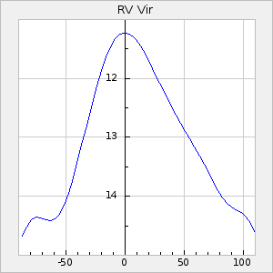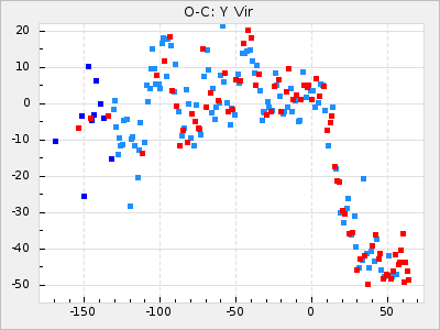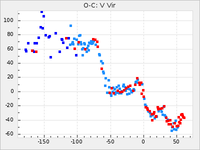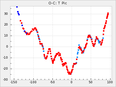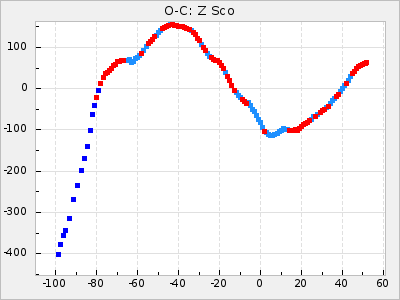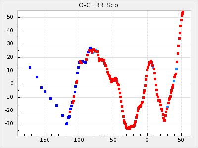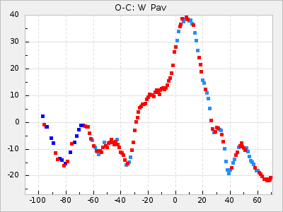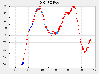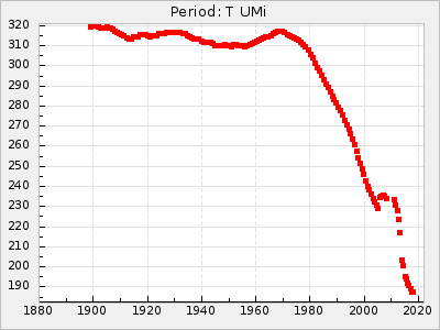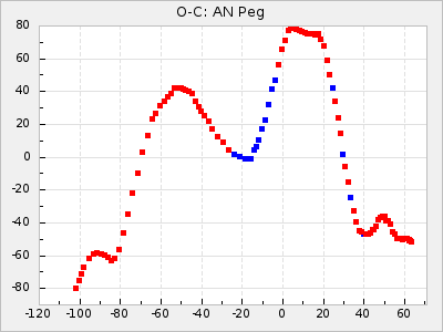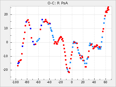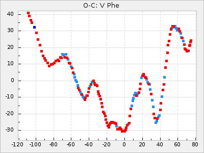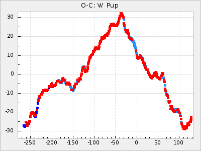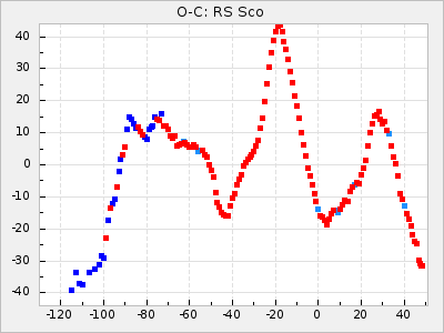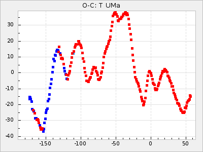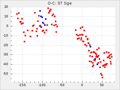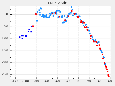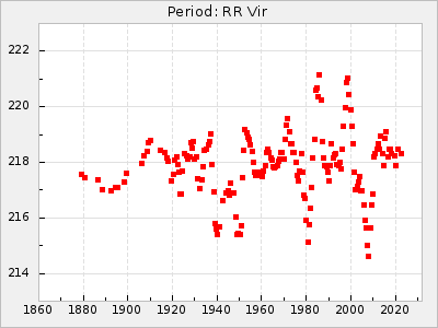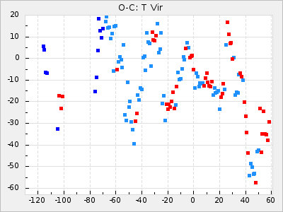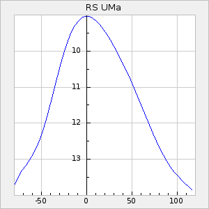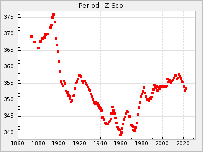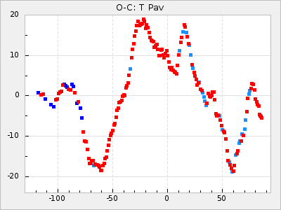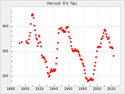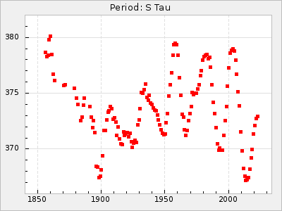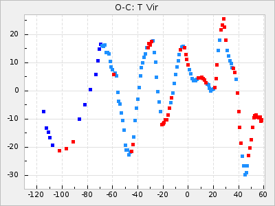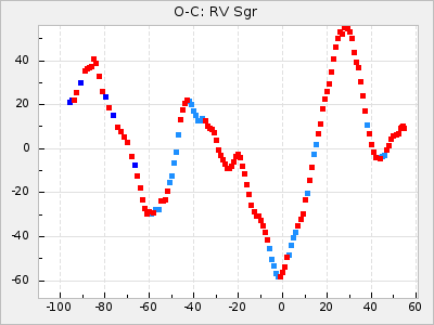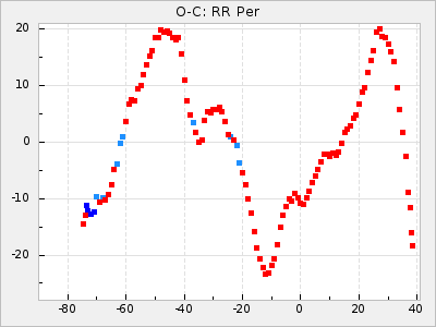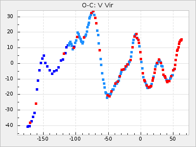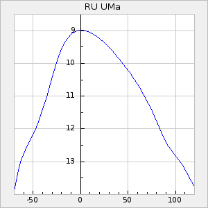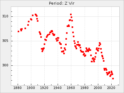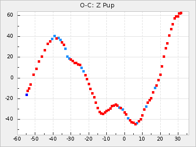Mean period: 373.75, Mean epoch: 2445164.1 LC Avg Per ΔP: -5.65 ±0.08 (t:70.6, r2:0.974), ΔEpoch: 5.1 ΔP/C: -0.012 ±0.003 (t:3.7, r2:0.095) Mag at max: 9.3 ±0.4 (8.1-10.8) GCVS period: 379.4, GCVS epoch: 2445159 GCVS spectral type: M6e-M8e E/P (X=15) ε2: 176.6, 2a2: -198.7, r2: 0.997 E/P (X=5) ε2: 143.8, 2a2: -115.7, r2: 0.973 |