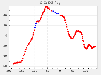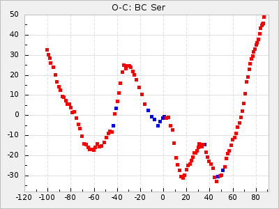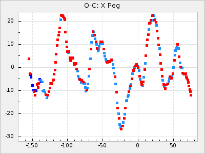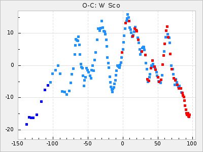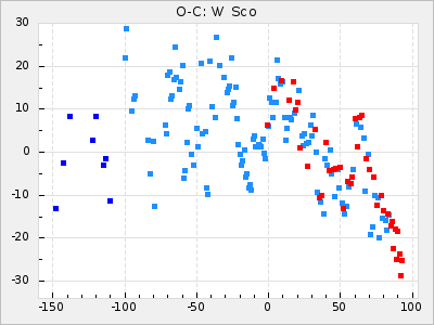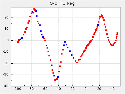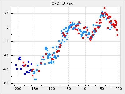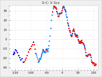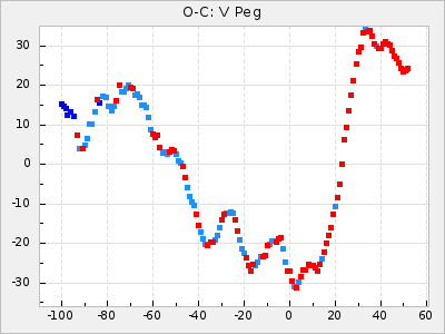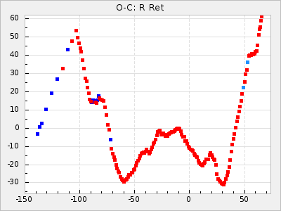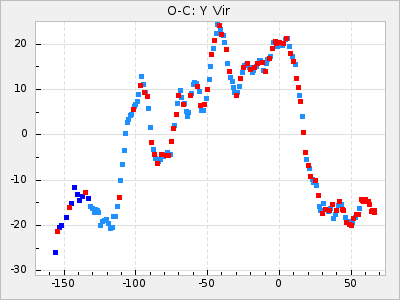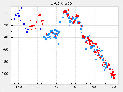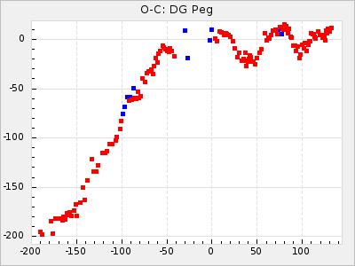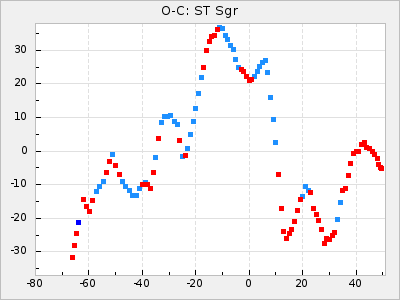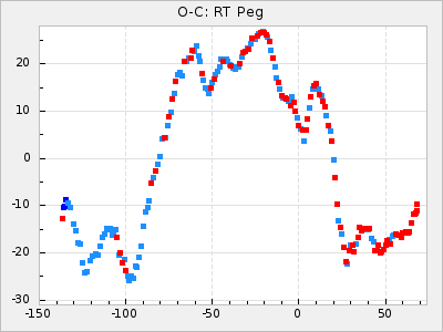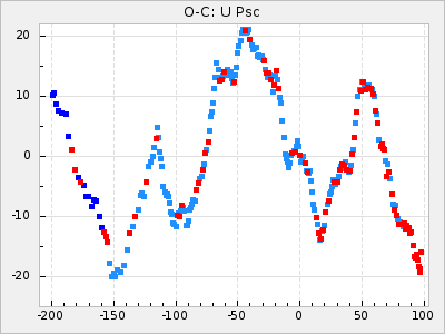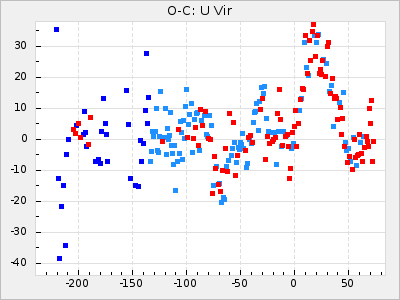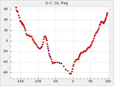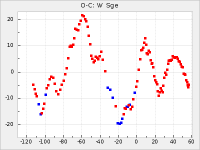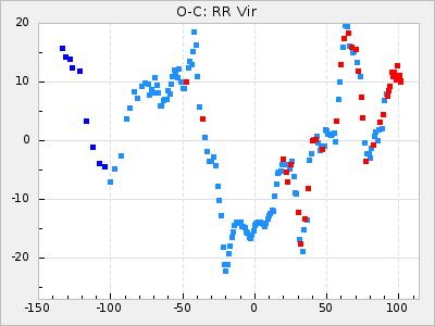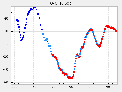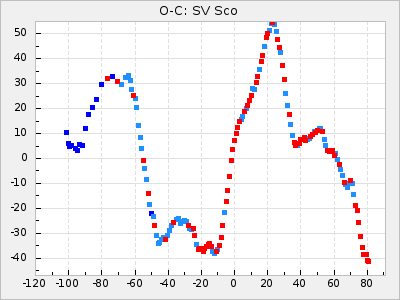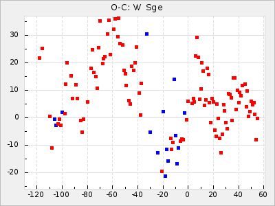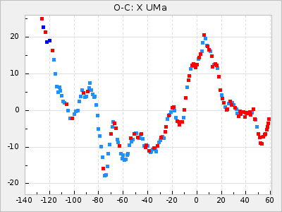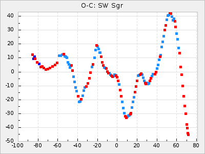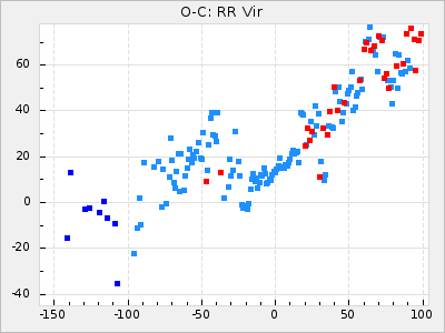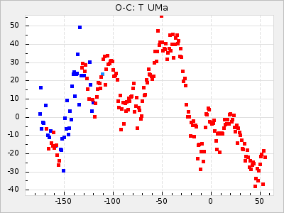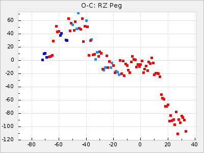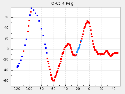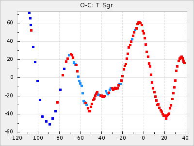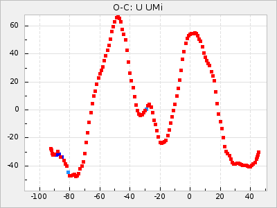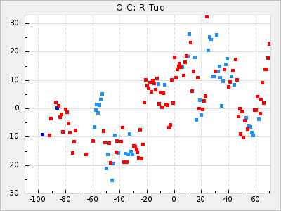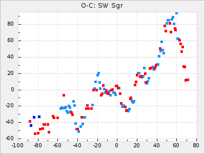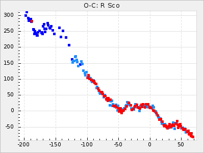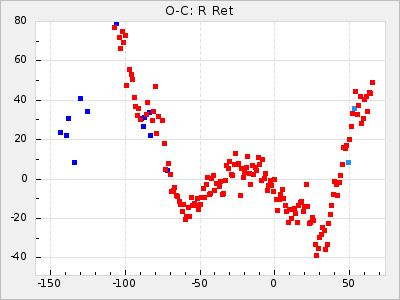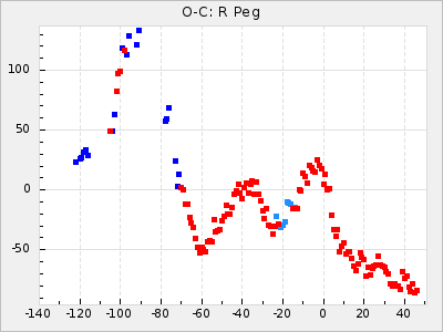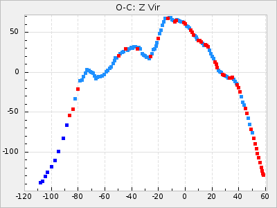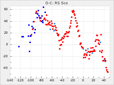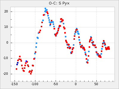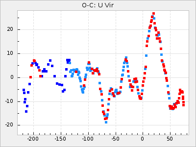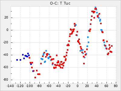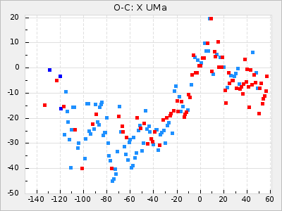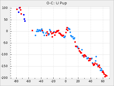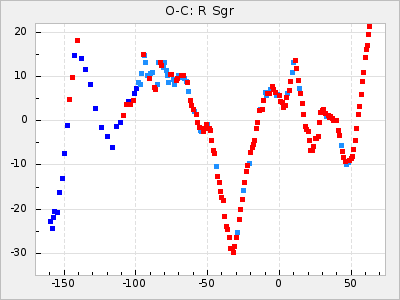 Here are O-C diagrams for a selection of Mira stars. The diagrams shows the cycle number (E) on the x-axis and O-C in days on the y-axis. The red dots are maxima that are fitted from observations, the lightblue are maxima published by AAVSO and the darkblue are maxima collected from various other published sources. The fitted maxima are based on observation data from AAVSO, AFOEV, VSOLJ, BAA/VSS, ASAS-SN and DASCH and calculated by using a mean lightcurve for each star. The mean lightcurves used can be found here. For a maxima to be recognized it had to fulfil these criteria: