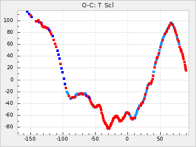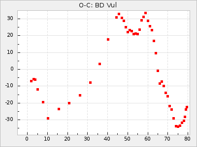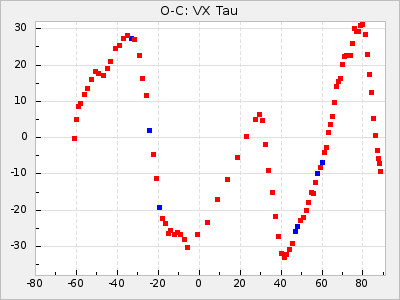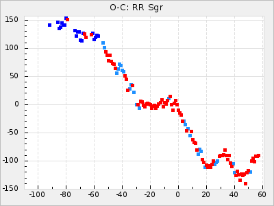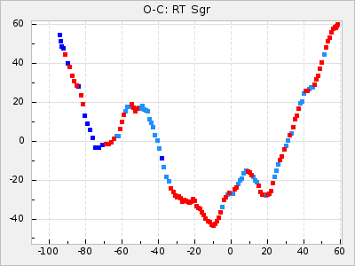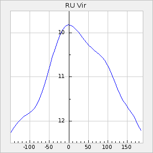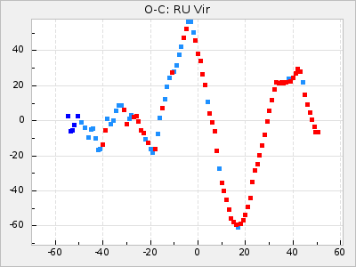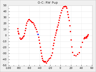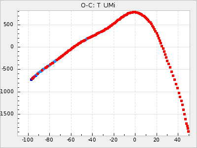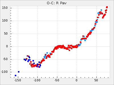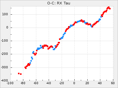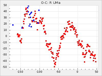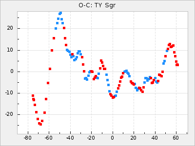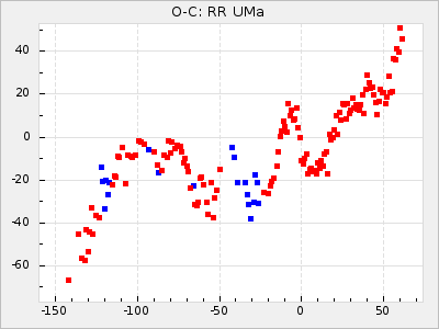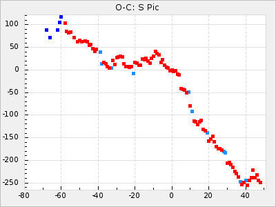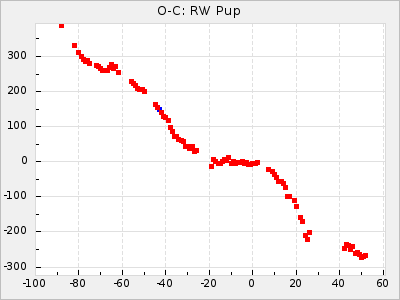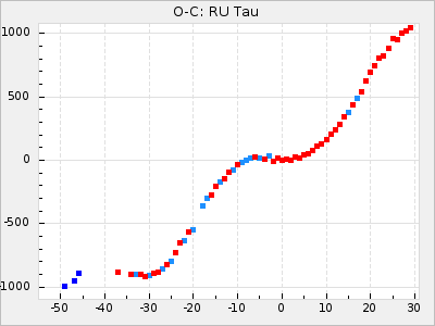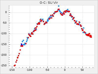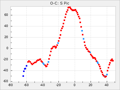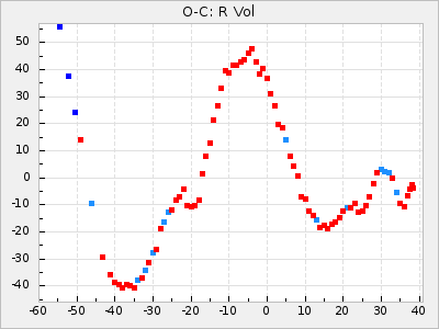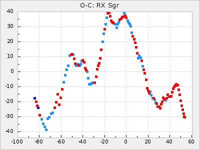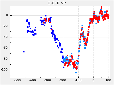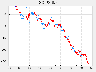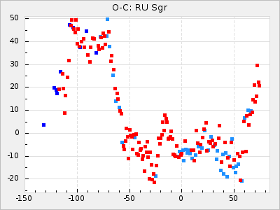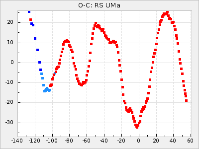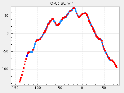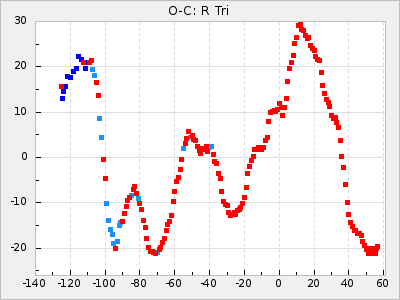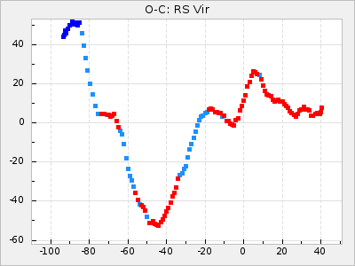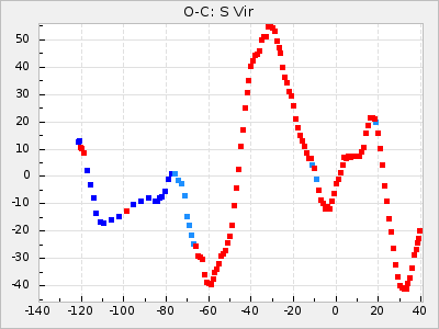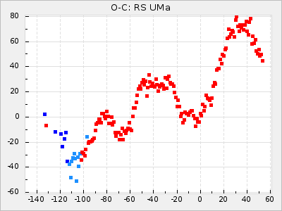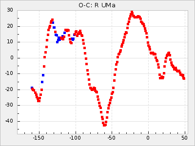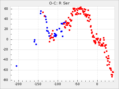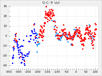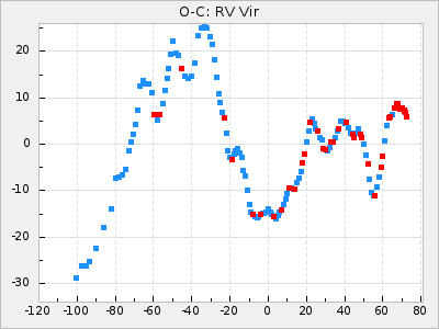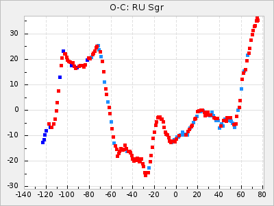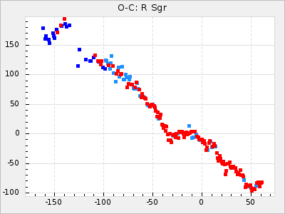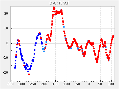 When a maximum fulfilling the criteria was found the mean lightcurve was fitted to the observations and the time and magnitude was noted. A preliminary O-C was then calculated by using the elements from GCVS4. In some cases a manual correction of the O-C was needed if the O-C is out of phase with more than a half cycle. From these O-C values an adjusted mean period and epoch was derived and new O-C values were calculated and plotted in the diagrams below.