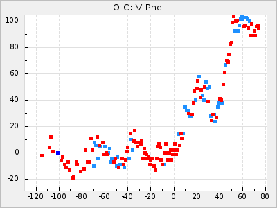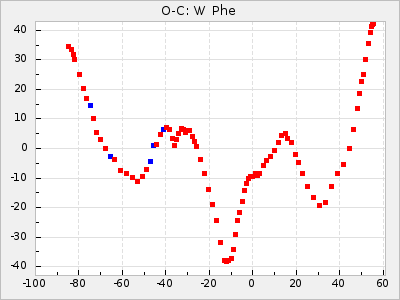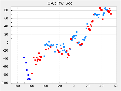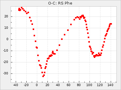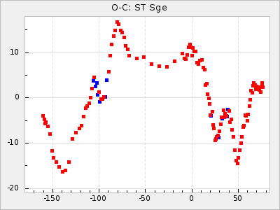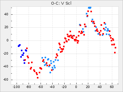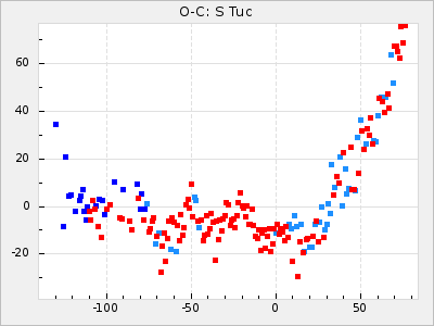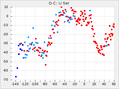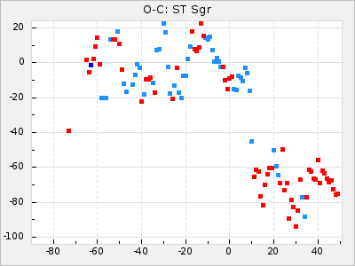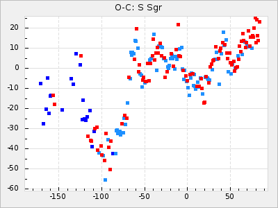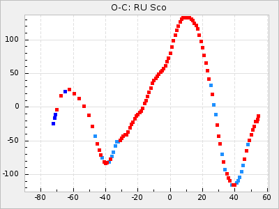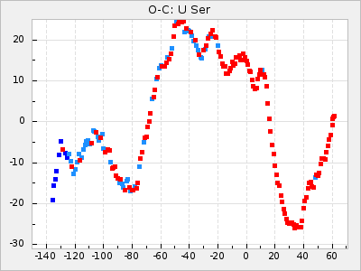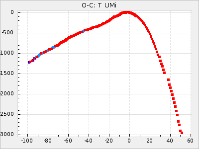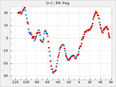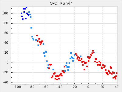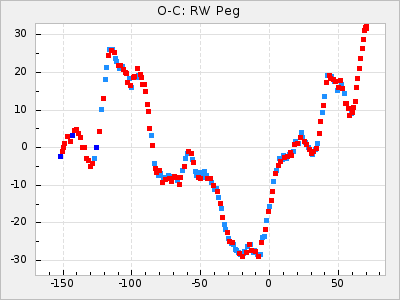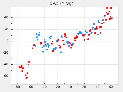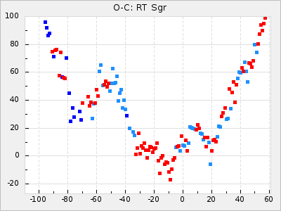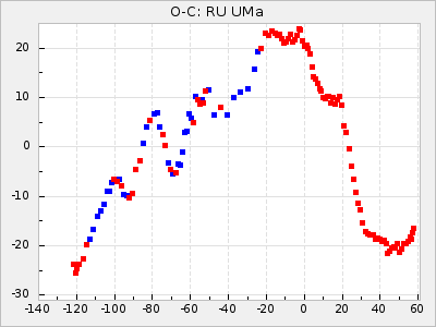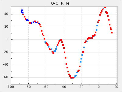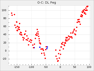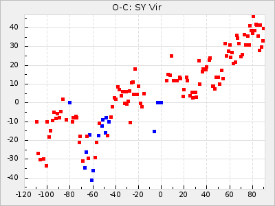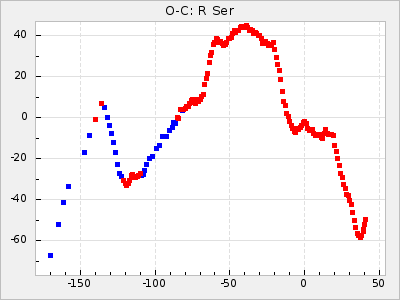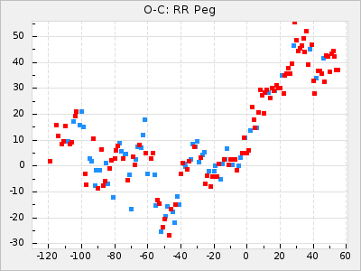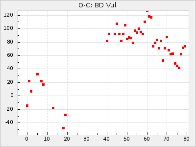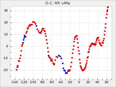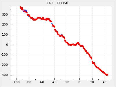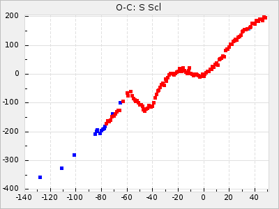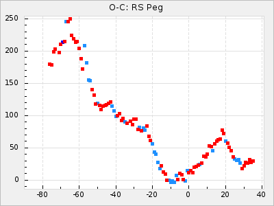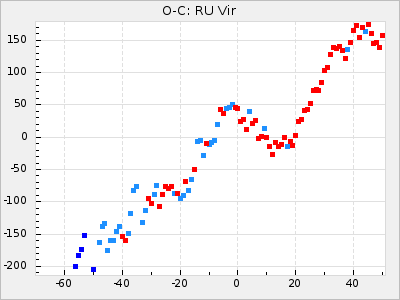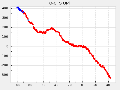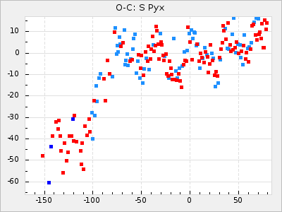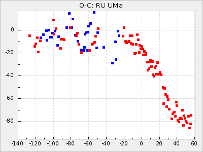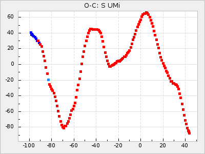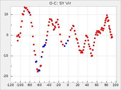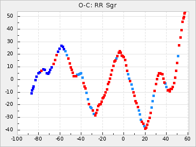 When a maximum fulfilling the criteria was found the mean lightcurve was fitted to the observations and the time and magnitude was noted. A preliminary O-C was then calculated by using the elements from GCVS4. In some cases a manual correction of the O-C was needed if the O-C is out of phase with more than a half cycle. From these O-C values an adjusted mean period and epoch was derived and new O-C values were calculated and plotted in the diagrams below.