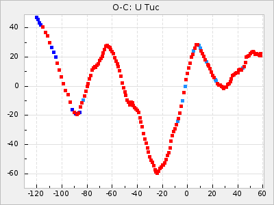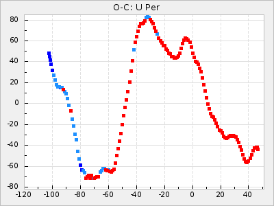 Mean period: 445.13, Mean epoch: 2440407.8 LC Avg Per ΔP: -4.77 ±0.09 (t:53.2, r2:0.965), ΔEpoch: -29.2 ΔP/C: -0.027 ±0.006 (t:4.6, r2:0.174) Mag at max: 9.2 ±0.6 (8.2-11.7) GCVS period: 449.9, GCVS epoch: 2440437 GCVS spectral type: M8e-M9.5 E/P (X=15) ε2: 94.1, 2a2: -20.2, r2: 0.98 E/P (X=5) ε2: 79.4, 2a2: -3.3, r2: 0.99 |