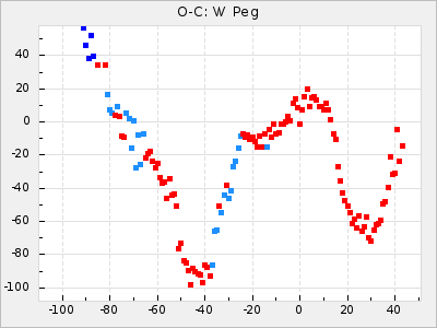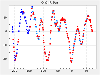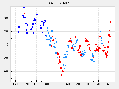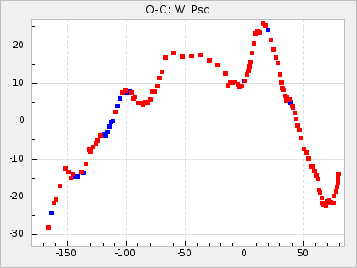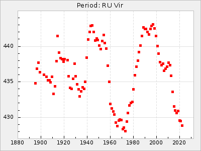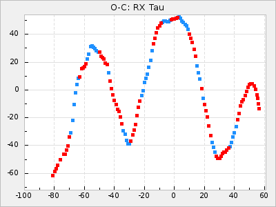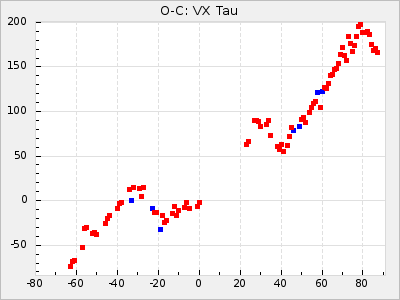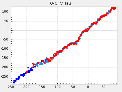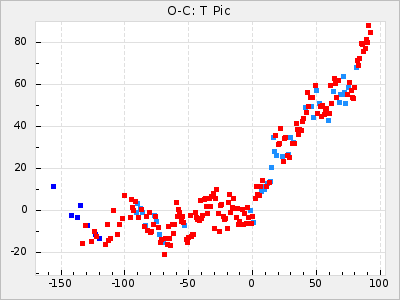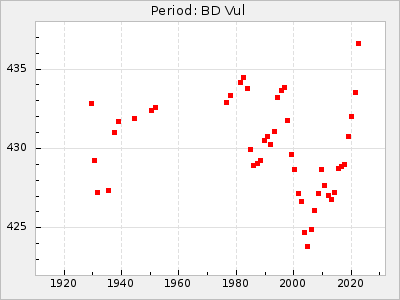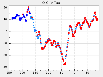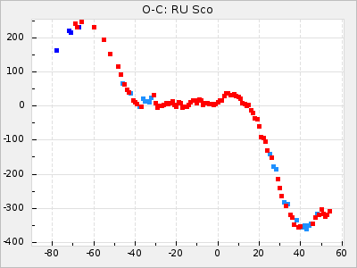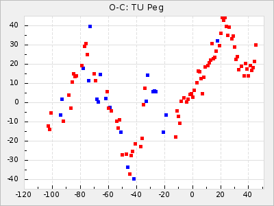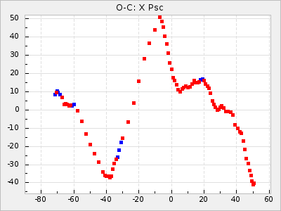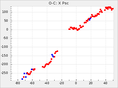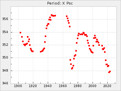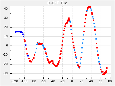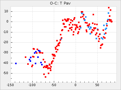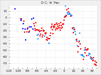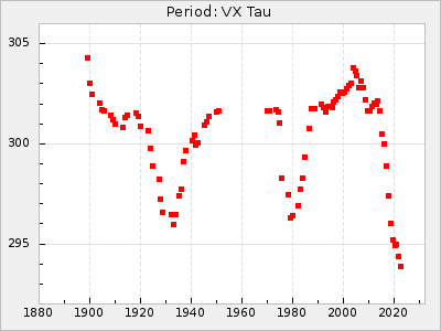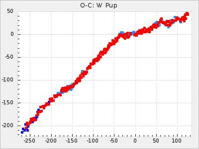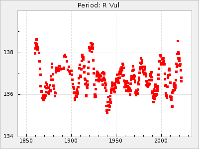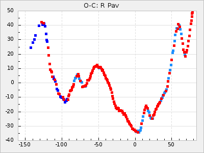 Mean period: 416.82, Mean epoch: 2445162.6 LC Avg Per ΔP: -7.98 ±0.18 (t:43.7, r2:0.955), ΔEpoch: -14.4 ΔP/C: -0.039 ±0.013 (t:3.1, r2:0.099) Mag at max: 8.9 ±0.3 (8.4-9.3) GCVS period: 424.8, GCVS epoch: 2445177 GCVS spectral type: M6e-M7e E/P (X=15) ε2: 459.2, 2a2: -896.1, r2: 0.984 E/P (X=5) ε2: 269.2, 2a2: -267, r2: 0.966 |