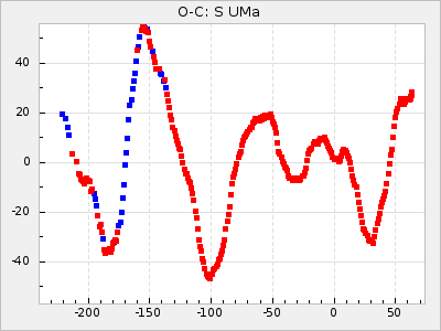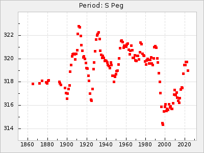 Mean period: 306.34, Mean epoch: 2445222.3 LC Avg Per ΔP: 2.74 ±0.04 (t:77.3, r2:0.982), ΔEpoch: 36.3 ΔP/C: -0.002 ±0.002 (t:1.1, r2:0.011) Mag at max: 8.6 ±0.2 (8.2-9.1) GCVS period: 303.6, GCVS epoch: 2445186 GCVS spectral type: S3,9e-S4.5,9e E/P (X=15) ε2: 36.3, 2a2: -35.6, r2: 0.933 E/P (X=5) ε2: 18.4, 2a2: 26.9, r2: 0.991 |