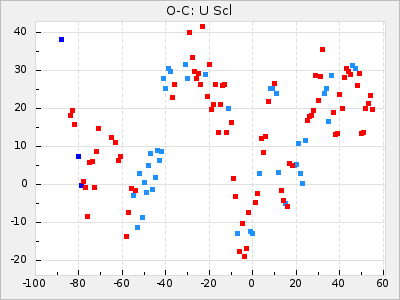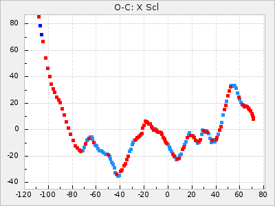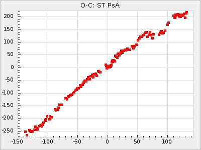 The 7th and 8th row is the result of the Eddington/Plakidis test. Before the test is made the linear component of the diagram is removed and is then done with X<=15 and X<=5. This test is to see if the changes in the O-C is likely due to small random cycle-to-cycle fluctuations or a real change of the period. See Irregularities of period of long-period variable stars for more information about this test. In short ε is the average random error in the period and a is the average error in determine the time for maximum. The star falls outside the test if the term 2a2 have a big negative value and could be a sign of real period changes.