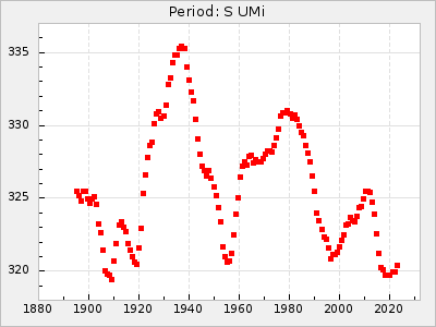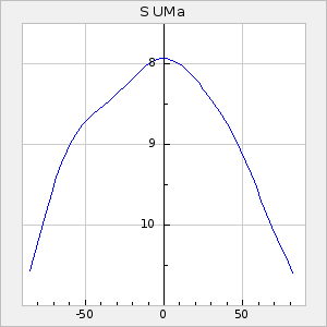Mean period: 326.70, Mean epoch: 2445083.5 LC Avg Per ΔP: -8.1 ±0.09 (t:91.7, r2:0.984), ΔEpoch: -6.5 ΔP/C: 0.021 ±0.004 (t:4.7, r2:0.14) Mag at max: 8.5 ±0.3 (7.9-9.8) GCVS period: 334.8, GCVS epoch: 2445090 GCVS spectral type: M6e-M8.5e(Tc) E/P (X=15) ε2: 141.9, 2a2: -290.8, r2: 0.966 E/P (X=5) ε2: 82.3, 2a2: -52.5, r2: 0.981 |