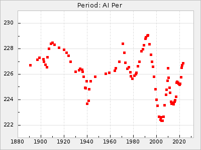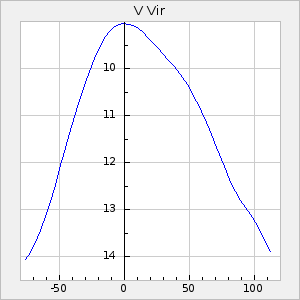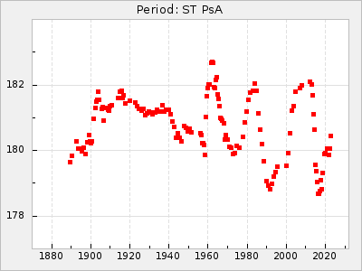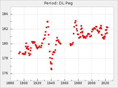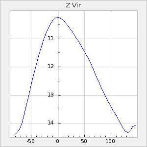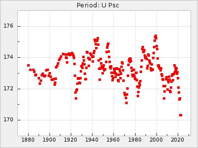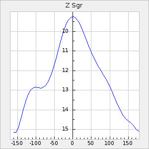 Mean period: 177.60, Mean epoch: 2441447.1 LC Avg Per ΔP: -0.32 ±0.01 (t:28.7, r2:0.751), ΔEpoch: -15.9 ΔP/C: 0.002 ±0 (t:9.6, r2:0.253) Mag at max: 10.8 ±0.4 (9.4-12.4) GCVS period: 177.92, GCVS epoch: 2441463 GCVS spectral type: M(3)e E/P (X=15) ε2: 13.1, 2a2: 1.4, r2: 0.979 E/P (X=5) ε2: 7.4, 2a2: 21.7, r2: 0.923 |