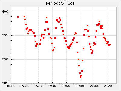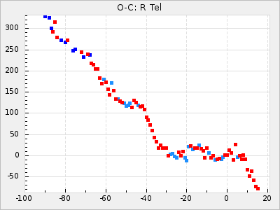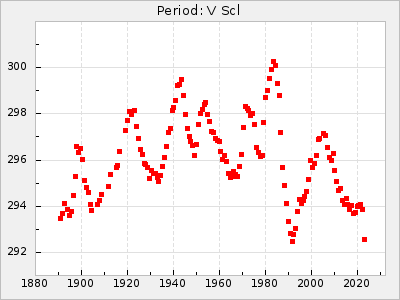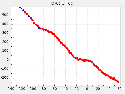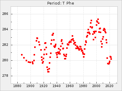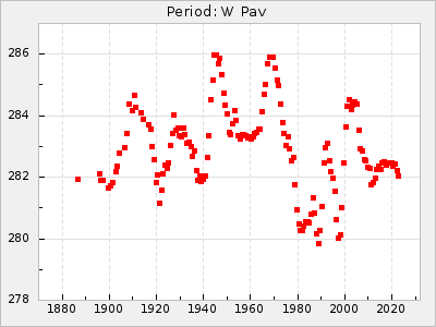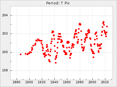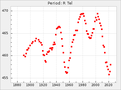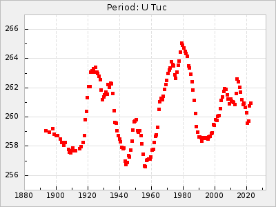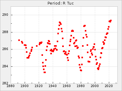 Mean period: 279.27, Mean epoch: 2445415.5 LC Avg Per ΔP: -2.18 ±0.03 (t:70.6, r2:0.966), ΔEpoch: -2.5 ΔP/C: 0.003 ±0.001 (t:2.7, r2:0.041) Mag at max: 6.2 ±0.3 (5.5-7.1) GCVS period: 281.45, GCVS epoch: 2445418 GCVS spectral type: M6II-IIIe-M9 E/P (X=15) ε2: 33.8, 2a2: -34.8, r2: 0.985 E/P (X=5) ε2: 20.5, 2a2: 12.6, r2: 0.985 |