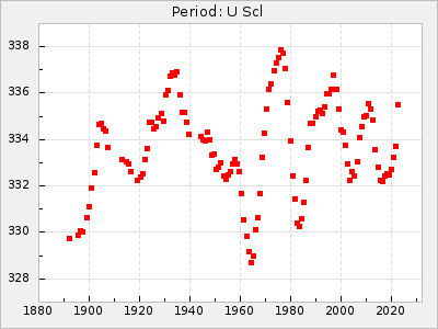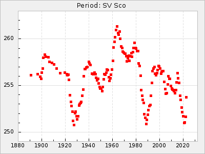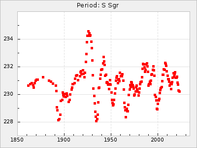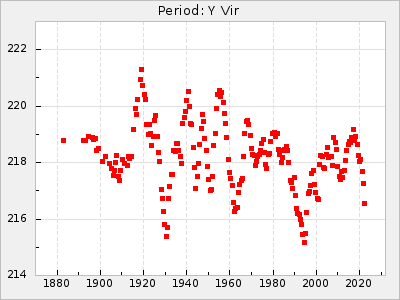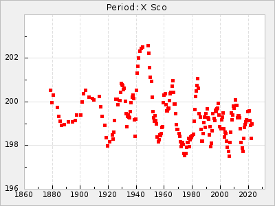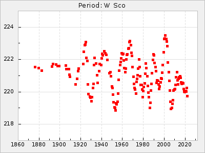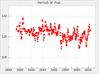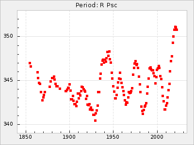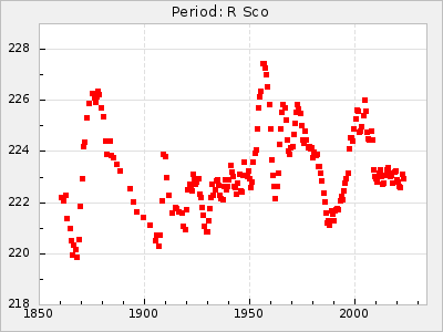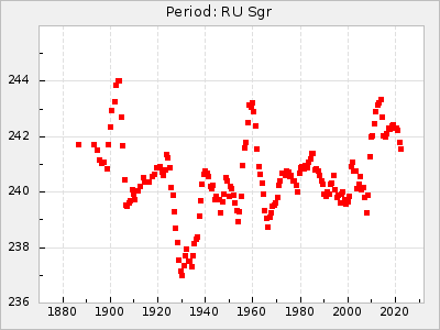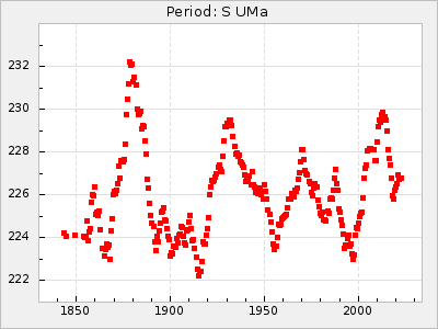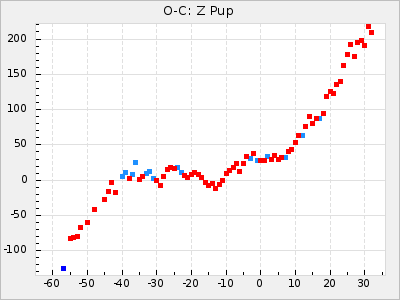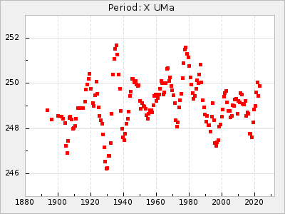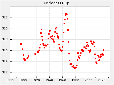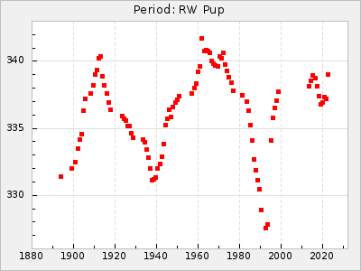 Mean period: 230.43, Mean epoch: 2442043.7 LC Avg Per ΔP: 0.97 ±0.02 (t:39.9, r2:0.883), ΔEpoch: 34.7 ΔP/C: 0.009 ±0.001 (t:13.9, r2:0.48) Mag at max: 8.1 ±0.4 (7.0-9.2) GCVS period: 229.46, GCVS epoch: 2442009 GCVS spectral type: M3e-M5(II)e E/P (X=15) ε2: 15.8, 2a2: 0.8, r2: 0.99 E/P (X=5) ε2: 11.7, 2a2: 12, r2: 0.926 |