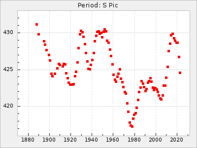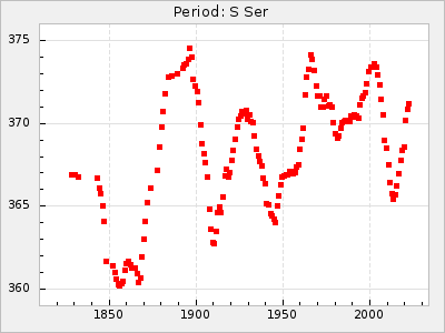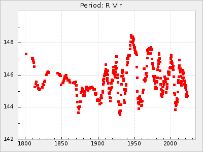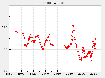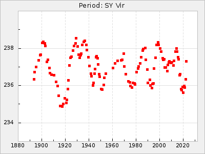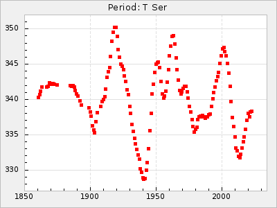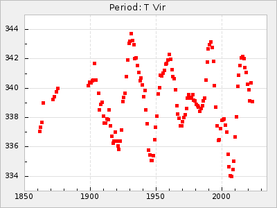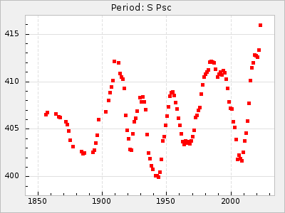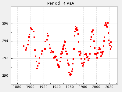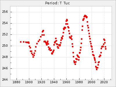 Mean period: 260.15, Mean epoch: 2445316.6 LC Avg Per ΔP: -4.75 ±0.1 (t:47.9, r2:0.935), ΔEpoch: -73.4 ΔP/C: -0.03 ±0.003 (t:9.4, r2:0.359) Mag at max: 9.3 ±0.4 (8.2-10.8) GCVS period: 264.9, GCVS epoch: 2445390 GCVS spectral type: M2e-M5e E/P (X=15) ε2: 246.3, 2a2: -602, r2: 0.963 E/P (X=5) ε2: 101.3, 2a2: -69.1, r2: 0.959 |