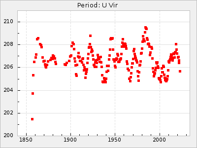 Mean period: 206.68, Mean epoch: 2444741.4 LC Avg Per ΔP: 0.04 ±0.01 (t:4.8, r2:0.085), ΔEpoch: 5.4 ΔP/C: -0 ±0 (t:0.5, r2:0.001) Mag at max: 8.2 ±0.3 (7.5-9.4) GCVS period: 206.64, GCVS epoch: 2444736 GCVS spectral type: M2e-M8e: E/P (X=15) ε2: 6.4, 2a2: 31.5, r2: 0.977 E/P (X=5) ε2: 5.9, 2a2: 33.7, r2: 0.858 |