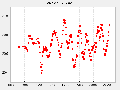 Mean period: 240.92, Mean epoch: 2441439.7 LC Avg Per ΔP: 0.21 ±0.02 (t:8.8, r2:0.287), ΔEpoch: 7.7 ΔP/C: 0.01 ±0.001 (t:19.1, r2:0.66) Mag at max: 9.1 ±0.6 (7.7-10.3) GCVS period: 240.71, GCVS epoch: 2441432 GCVS spectral type: M3e-M5II-Ibe E/P (X=15) ε2: 8.6, 2a2: 24.8, r2: 0.979 E/P (X=5) ε2: 6.2, 2a2: 34.2, r2: 0.699 |