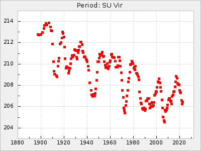 Mean period: 210.01, Mean epoch: 2445359.0 LC Avg Per ΔP: 0.12 ±0.01 (t:13.5, r2:0.409), ΔEpoch: 20 ΔP/C: 0 ±0 (t:0.1, r2:0) Mag at max: 8.9 ±0.4 (8.0-10.3) GCVS period: 209.89, GCVS epoch: 2445339 GCVS spectral type: M2e-M5e E/P (X=15) ε2: 11.6, 2a2: 17.6, r2: 0.989 E/P (X=5) ε2: 8.6, 2a2: 27.6, r2: 0.979 |