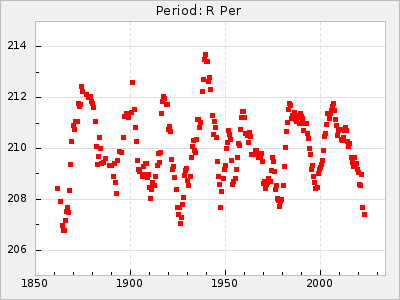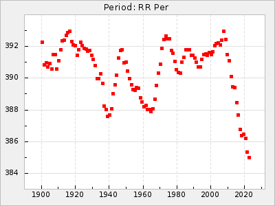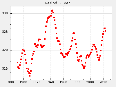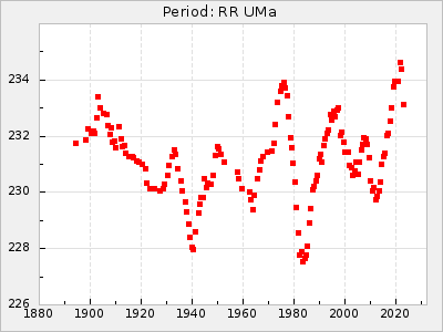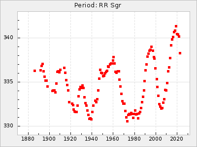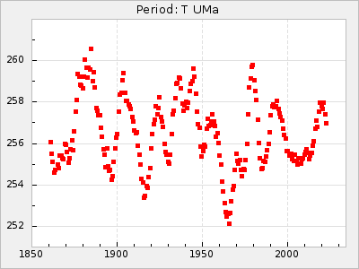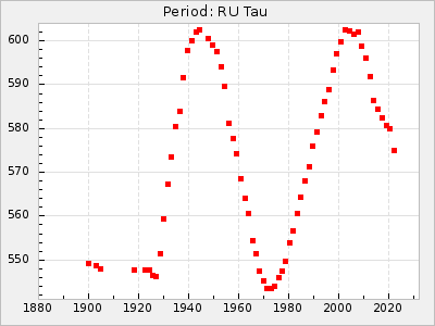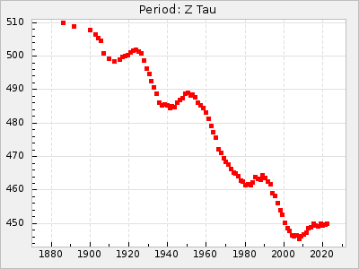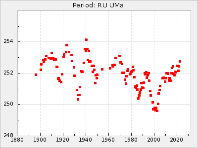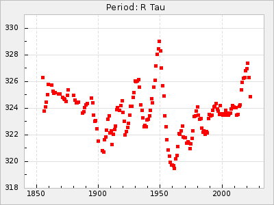 Mean period: 240.29, Mean epoch: 2441902.7 LC Avg Per ΔP: -0.2 ±0.02 (t:9.8, r2:0.338), ΔEpoch: 2.7 ΔP/C: 0.006 ±0.001 (t:9.7, r2:0.335) Mag at max: 7.3 ±0.4 (6.4-9.5) GCVS period: 240.49, GCVS epoch: 2441900 GCVS spectral type: M3e-M6e E/P (X=15) ε2: 10.6, 2a2: 5, r2: 0.99 E/P (X=5) ε2: 7.9, 2a2: 13.8, r2: 0.977 |