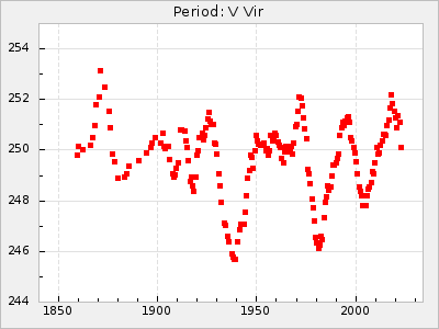 Mean period: 249.44, Mean epoch: 2444657.2 LC Avg Per ΔP: -0.64 ±0.02 (t:33.4, r2:0.853), ΔEpoch: -9.8 ΔP/C: -0.002 ±0.001 (t:4.1, r2:0.08) Mag at max: 9.1 ±0.5 (8.2-10.3) GCVS period: 250.08, GCVS epoch: 2444667 GCVS spectral type: M3e-M6e E/P (X=15) ε2: 18.4, 2a2: -10, r2: 0.976 E/P (X=5) ε2: 9, 2a2: 21.2, r2: 0.928 |