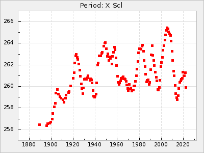 Mean period: 261.38, Mean epoch: 2441429.9 LC Avg Per ΔP: -0.25 ±0.04 (t:7.1, r2:0.236), ΔEpoch: 4.9 ΔP/C: 0.014 ±0.001 (t:13.9, r2:0.544) Mag at max: 10.6 ±0.3 (9.9-11.3) GCVS period: 261.63, GCVS epoch: 2441425 GCVS spectral type: E/P (X=15) ε2: 18.8, 2a2: 15.2, r2: 0.975 E/P (X=5) ε2: 20.5, 2a2: 9, r2: 0.992 |