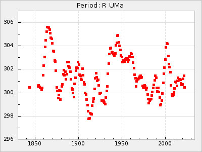 Mean period: 300.50, Mean epoch: 2433631.6 LC Avg Per ΔP: 1.6 ±0.05 (t:33.5, r2:0.923), ΔEpoch: 31.6 ΔP/C: 0.014 ±0.002 (t:6.2, r2:0.295) Mag at max: 10.1 ±0.4 (9.5-11.3) GCVS period: 298.9, GCVS epoch: 2433600 GCVS spectral type: M8e E/P (X=15) ε2: 51.9, 2a2: -61.5, r2: 0.961 E/P (X=5) ε2: 30.1, 2a2: 15.5, r2: 0.987 |