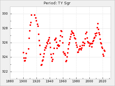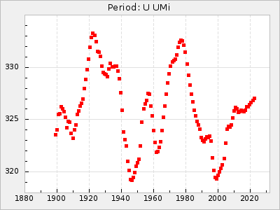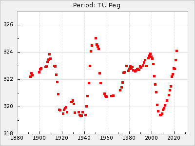 Mean period: 325.93, Mean epoch: 2440062.3 LC Avg Per ΔP: 0.52 ±0.03 (t:19, r2:0.736), ΔEpoch: 6.3 ΔP/C: -0 ±0.001 (t:0.1, r2:0) Mag at max: 9.9 ±0.5 (9.0-12.8) GCVS period: 325.41, GCVS epoch: 2440056 GCVS spectral type: M3e E/P (X=15) ε2: 7.7, 2a2: 41.6, r2: 0.968 E/P (X=5) ε2: 11.8, 2a2: 28.6, r2: 0.898 |