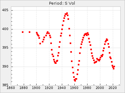 Mean period: 392.94, Mean epoch: 2444844.2 LC Avg Per ΔP: -1.72 ±0.08 (t:22.8, r2:0.803), ΔEpoch: -52.8 ΔP/C: 0.004 ±0.004 (t:1.1, r2:0.009) Mag at max: 8.2 ±0.3 (7.4-9.5) GCVS period: 394.66, GCVS epoch: 2444897 GCVS spectral type: S4.5,8e-S5.5,8e E/P (X=15) ε2: 121.9, 2a2: -125.7, r2: 0.985 E/P (X=5) ε2: 76.9, 2a2: 13.2, r2: 0.979 |