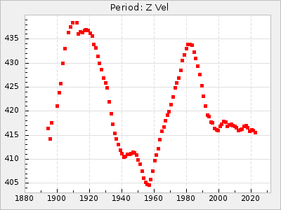 Mean period: 420.08, Mean epoch: 2440004.2 LC Avg Per ΔP: 8.68 ±0.28 (t:31, r2:0.899), ΔEpoch: 106.2 ΔP/C: -0.063 ±0.018 (t:3.5, r2:0.1) Mag at max: 9.4 ±0.4 (8.4-10.2) GCVS period: 411.4, GCVS epoch: 2439898 GCVS spectral type: M9e E/P (X=15) ε2: 888.9, 2a2: -2230.5, r2: 0.966 E/P (X=5) ε2: 383.4, 2a2: -375, r2: 0.972 |