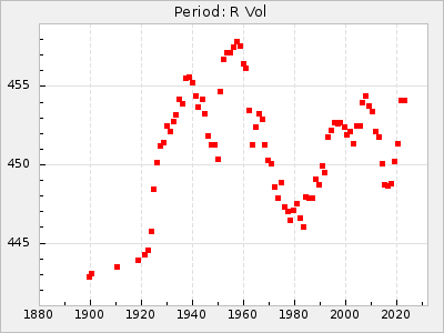 Mean period: 451.45, Mean epoch: 2442226.1 LC Avg Per ΔP: -2.15 ±0.14 (t:15.8, r2:0.744), ΔEpoch: -52.9 ΔP/C: -0.003 ±0.011 (t:0.3, r2:0.001) Mag at max: 10.6 ±0.9 (8.2-12.2) GCVS period: 453.6, GCVS epoch: 2442279 GCVS spectral type: C(N)e E/P (X=15) ε2: 70.7, 2a2: 49.2, r2: 0.952 E/P (X=5) ε2: 43.5, 2a2: 165.3, r2: 0.882 |