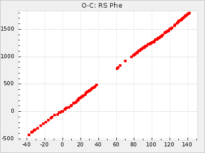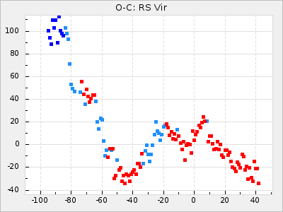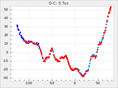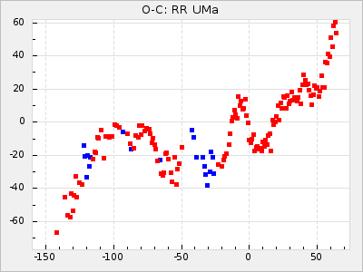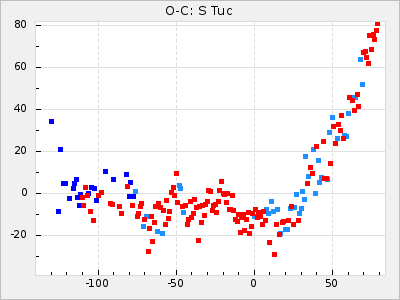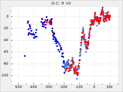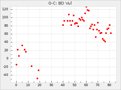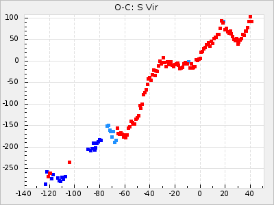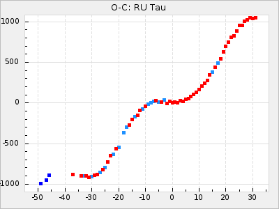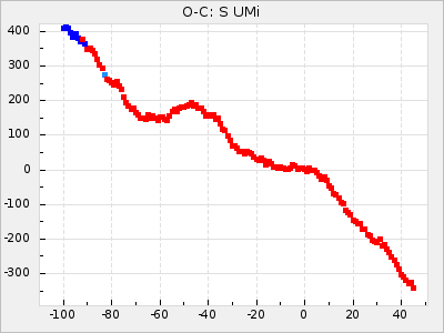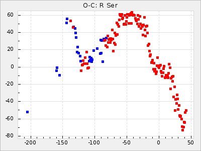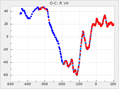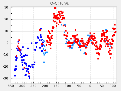 When a maximum fulfilling the criteria was found the mean lightcurve was fitted to the observations and the time and magnitude was noted. A preliminary O-C was then calculated by using the elements from GCVS4. In some cases a manual correction of the O-C was needed if the O-C is out of phase with more than a half cycle. From these O-C values an adjusted mean period and epoch was derived and new O-C values were calculated and plotted in the diagrams below.