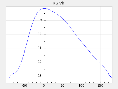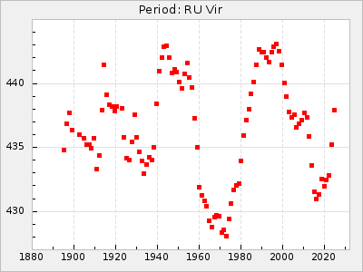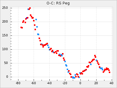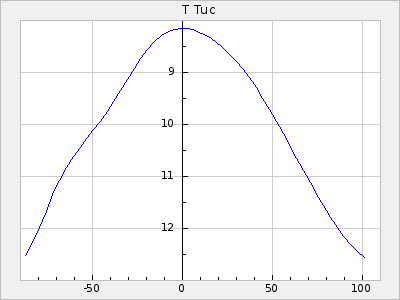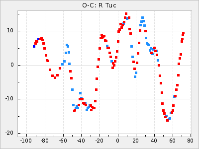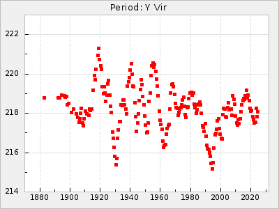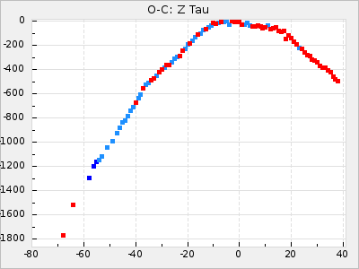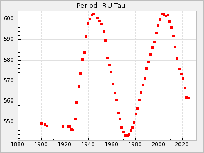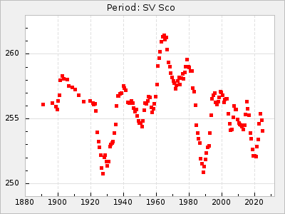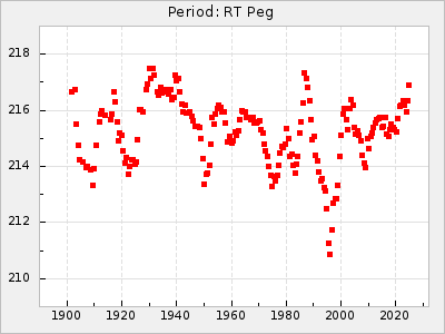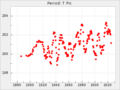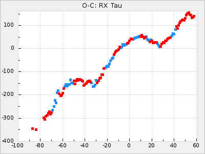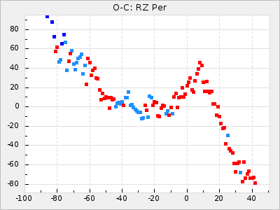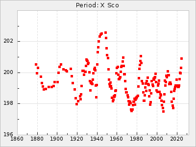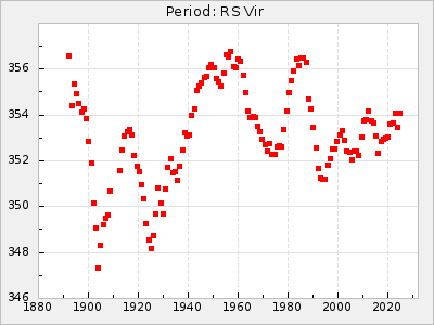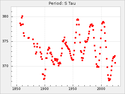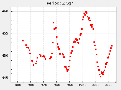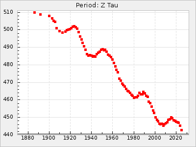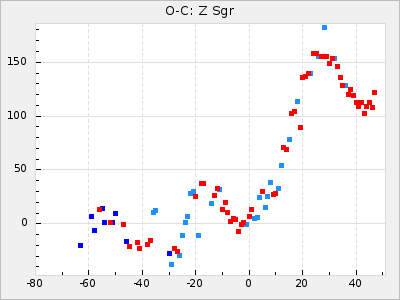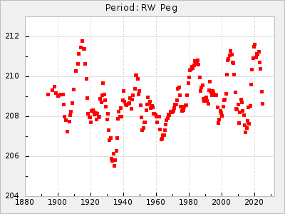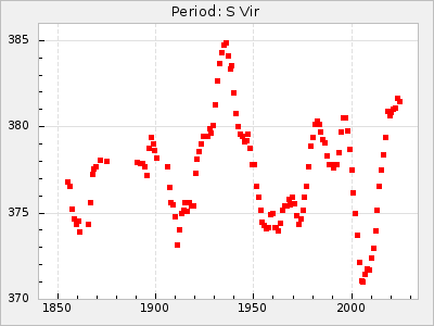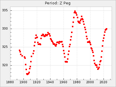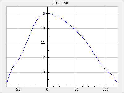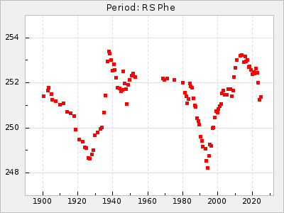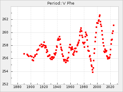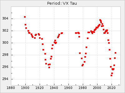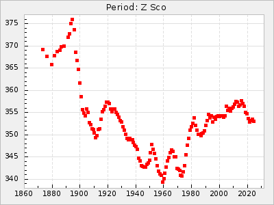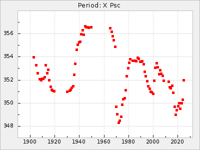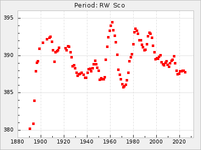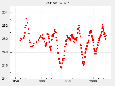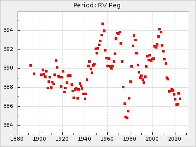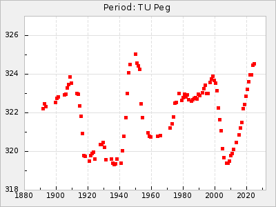 Mean period: 373.75, Mean epoch: 2445164.1 LC Avg Per ΔP: -5.65 ±0.08 (t:70.6, r2:0.974), ΔEpoch: 5.1 ΔP/C: -0.012 ±0.003 (t:3.7, r2:0.095) Mag at max: 9.3 ±0.4 (8.1-10.8) GCVS period: 379.4, GCVS epoch: 2445159 GCVS spectral type: M6e-M8e E/P (X=15) ε2: 176.6, 2a2: -198.7, r2: 0.997 E/P (X=5) ε2: 143.8, 2a2: -115.7, r2: 0.973 |