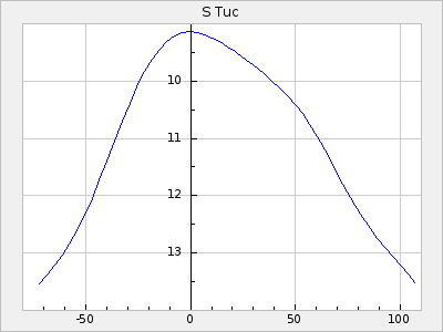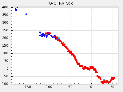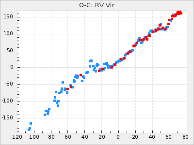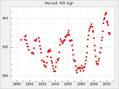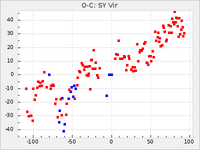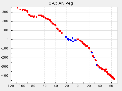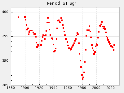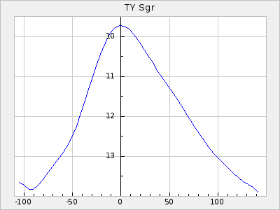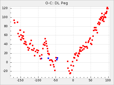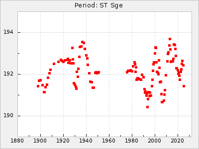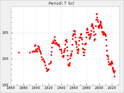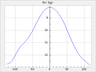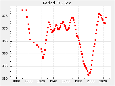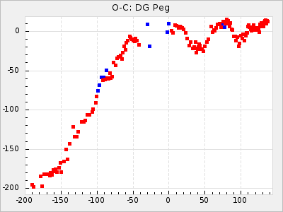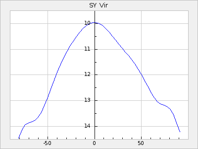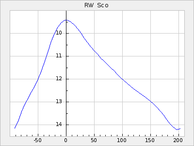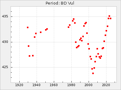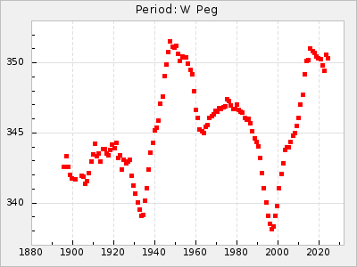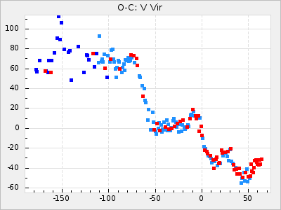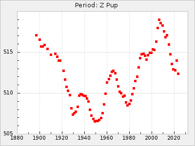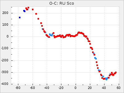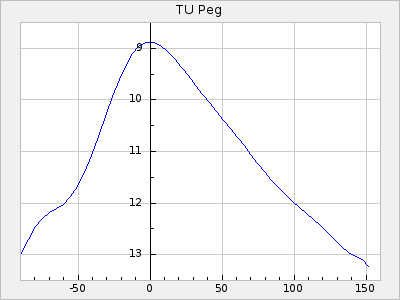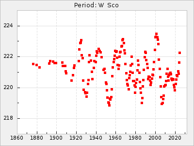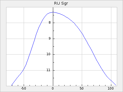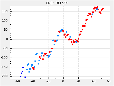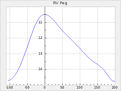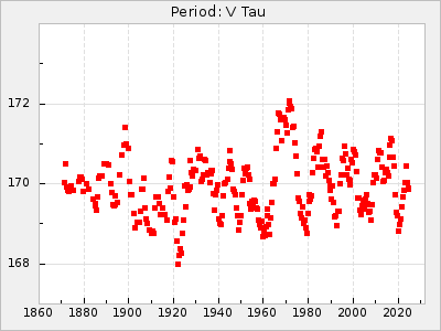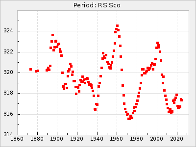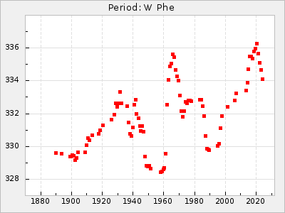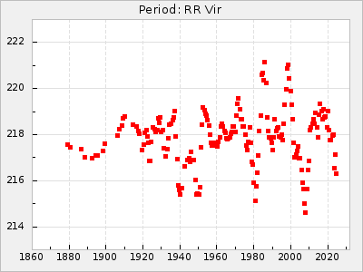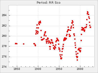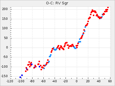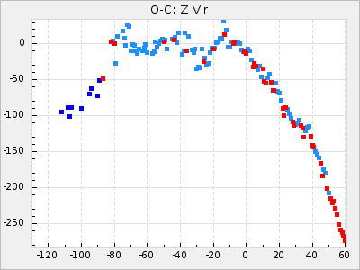Mean period: 373.75, Mean epoch: 2445164.1 LC Avg Per ΔP: -5.65 ±0.08 (t:70.6, r2:0.974), ΔEpoch: 5.1 ΔP/C: -0.012 ±0.003 (t:3.7, r2:0.095) Mag at max: 9.3 ±0.4 (8.1-10.8) GCVS period: 379.4, GCVS epoch: 2445159 GCVS spectral type: M6e-M8e E/P (X=15) ε2: 176.6, 2a2: -198.7, r2: 0.997 E/P (X=5) ε2: 143.8, 2a2: -115.7, r2: 0.973 |