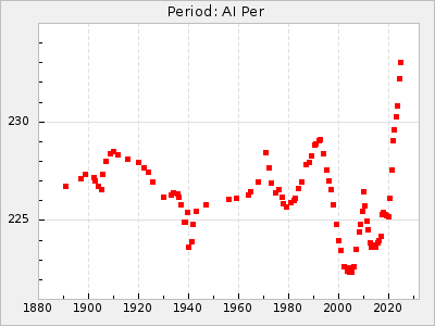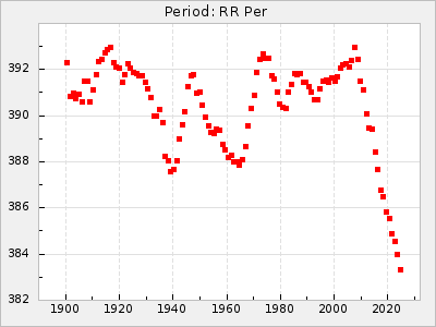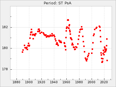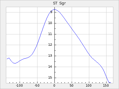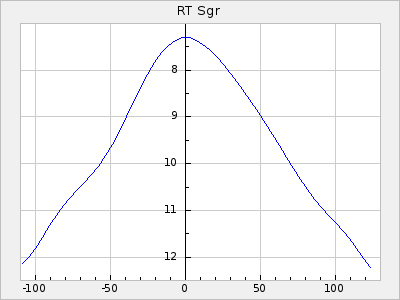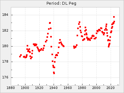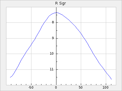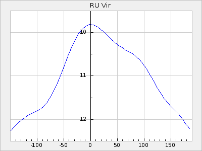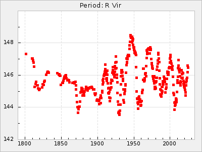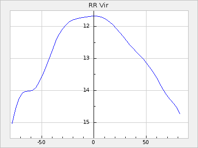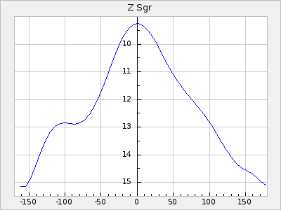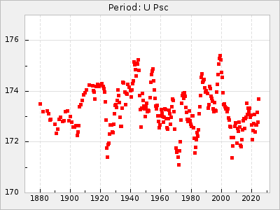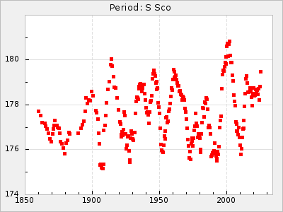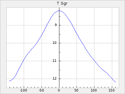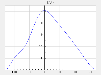 Mean period: 177.60, Mean epoch: 2441447.1 LC Avg Per ΔP: -0.32 ±0.01 (t:28.7, r2:0.751), ΔEpoch: -15.9 ΔP/C: 0.002 ±0 (t:9.6, r2:0.253) Mag at max: 10.8 ±0.4 (9.4-12.4) GCVS period: 177.92, GCVS epoch: 2441463 GCVS spectral type: M(3)e E/P (X=15) ε2: 13.1, 2a2: 1.4, r2: 0.979 E/P (X=5) ε2: 7.4, 2a2: 21.7, r2: 0.923 |