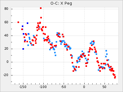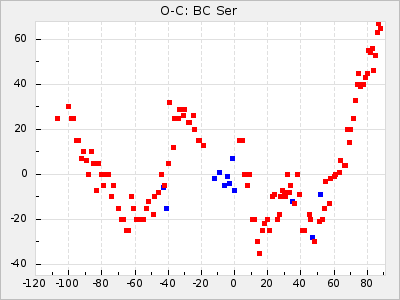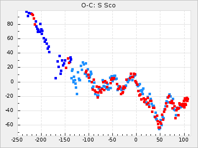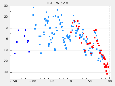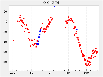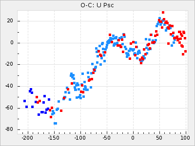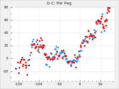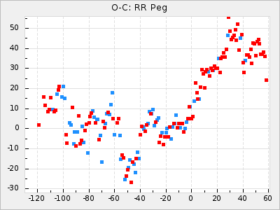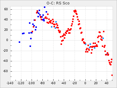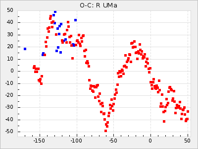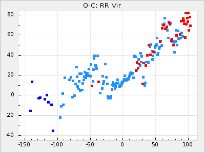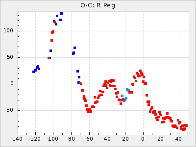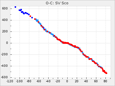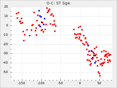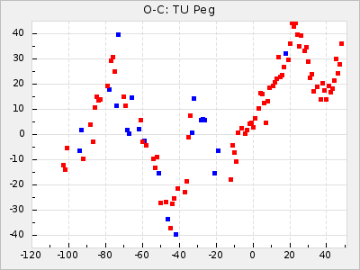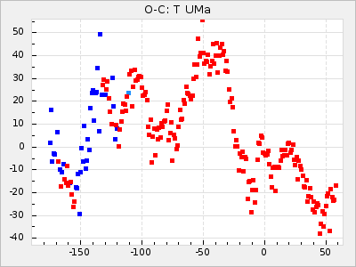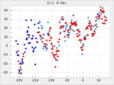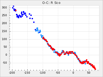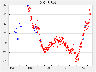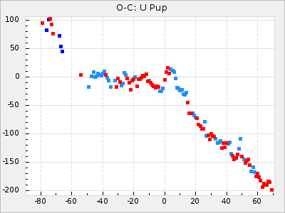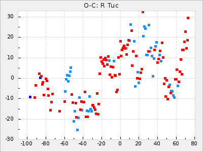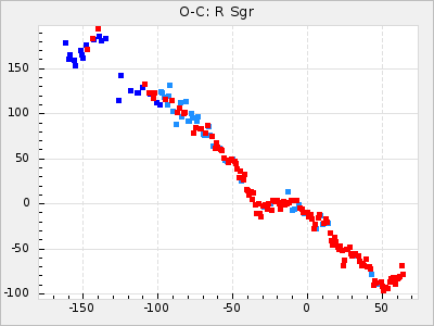 Here are O-C diagrams for a selection of Mira stars. The diagrams shows the cycle number (E) on the x-axis and O-C in days on the y-axis. The red dots are maxima that are fitted from observations, the lightblue are maxima published by AAVSO and the darkblue are maxima collected from various other published sources. The fitted maxima are based on observation data from AAVSO, AFOEV, VSOLJ, BAA/VSS, ASAS-SN and DASCH and calculated by using a mean lightcurve for each star. The mean lightcurves used can be found here. For a maxima to be recognized it had to fulfil these criteria: